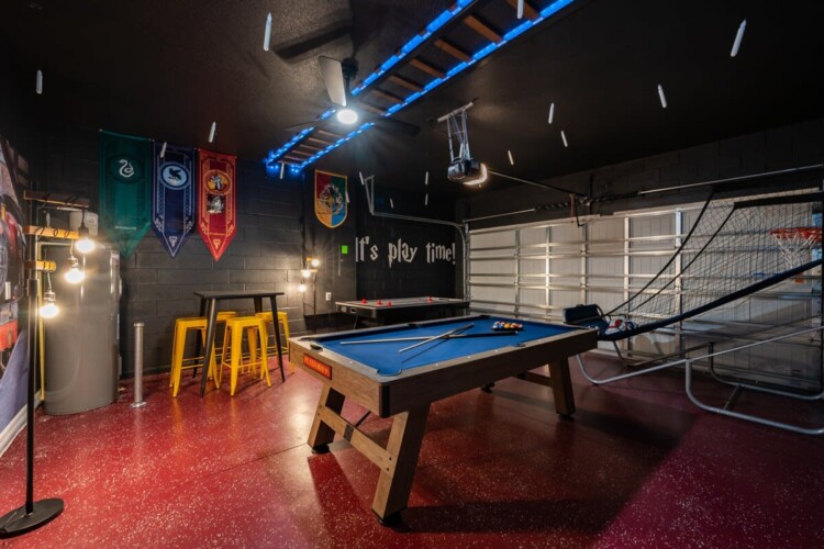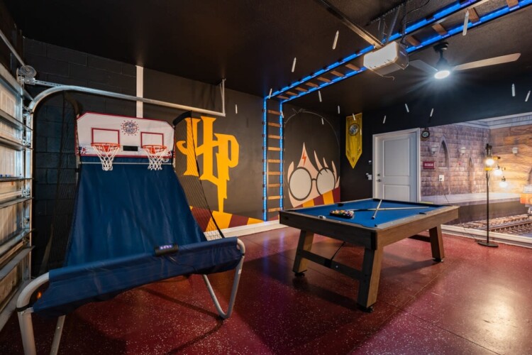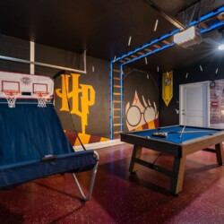 You will have a blast here! Kids of all size will enjoy our Harry Potter themed game room with Basketball, pool table, and an air hockey table for hours of fun. When it’s time to relax gather the family inside the movie theater on the second floor.