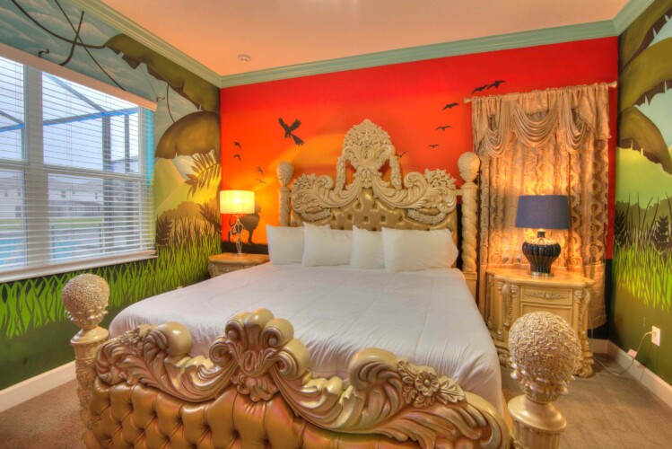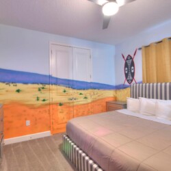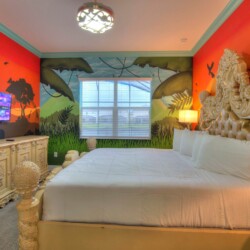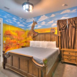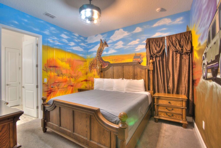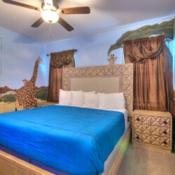 Step into our expansive Safari-themed villa, where adventure meets comfort. The open-concept design seamlessly connects the living area to a fully-equipped kitchen with a massive island perfect for group dining. Key features include: