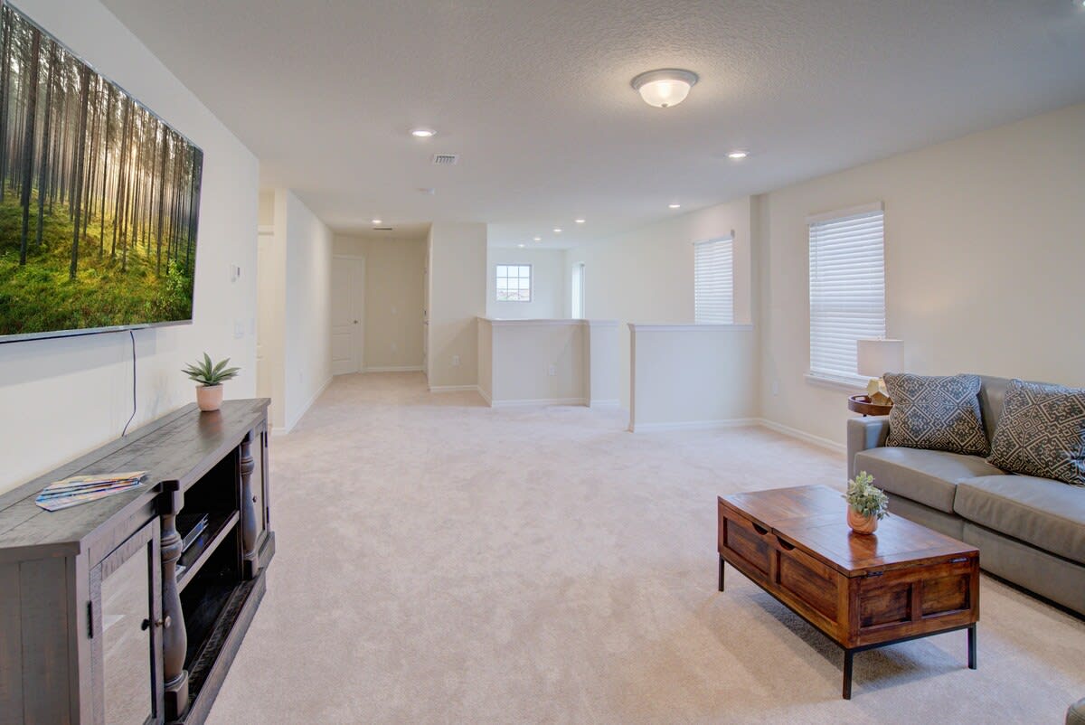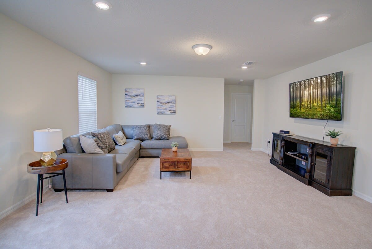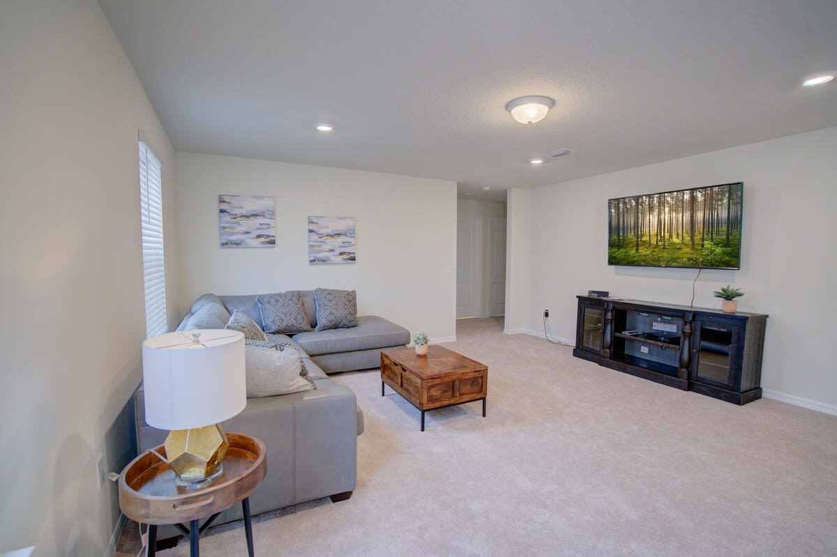The great room was designed to enjoy a great family time. We have a sofa and also an ottoman for lying down or as an extra seat. It is a smart TV you will have more apps available to sign in.