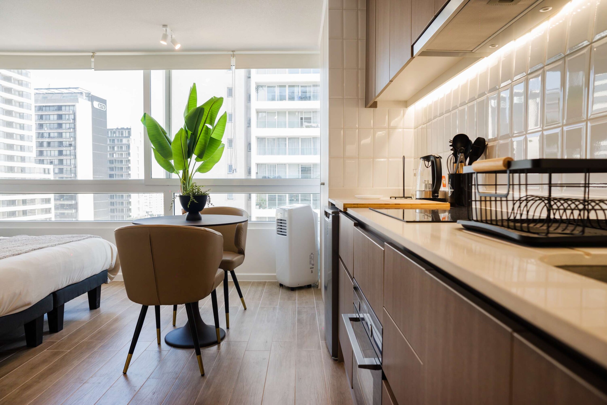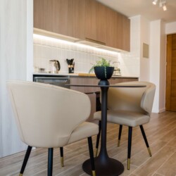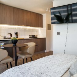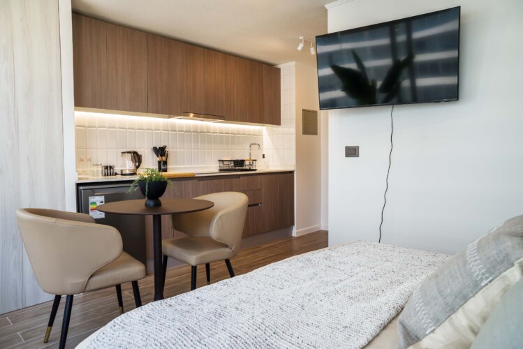 Welcome to your urban escape! This well-designed studio apartment blends comfort and functionality into a single, open living area. Settle in and unwind on the comfortable double bed while watching your favorite shows on the TV. The space also includes a charming dining nook with a table and two chairs, ideal for enjoying a meal or a cup of coffee. You’ll find a compact but efficient kitchenette with a mini fridge and all the basic tools for preparing light meals. The private bathroom is equipped with a bathtub and reliable hot water, perfect for a relaxing soak after a long day.