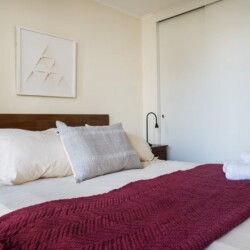 • The serene bedroom promises restful nights with plush bed linens and a calming ambiance, accommodating two guests comfortably.