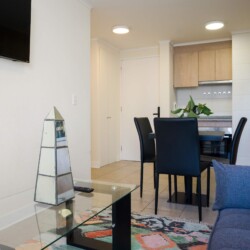 • Enter a chic open-plan living area where modern comfort meets elegance, featuring a cozy seating arrangement and a flat-screen TV for your entertainment.