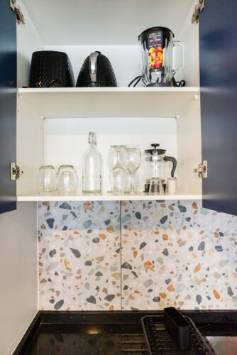 – **Living Area** Open-plan with a plush sofa bed and sleek TV, ideal for relaxation.