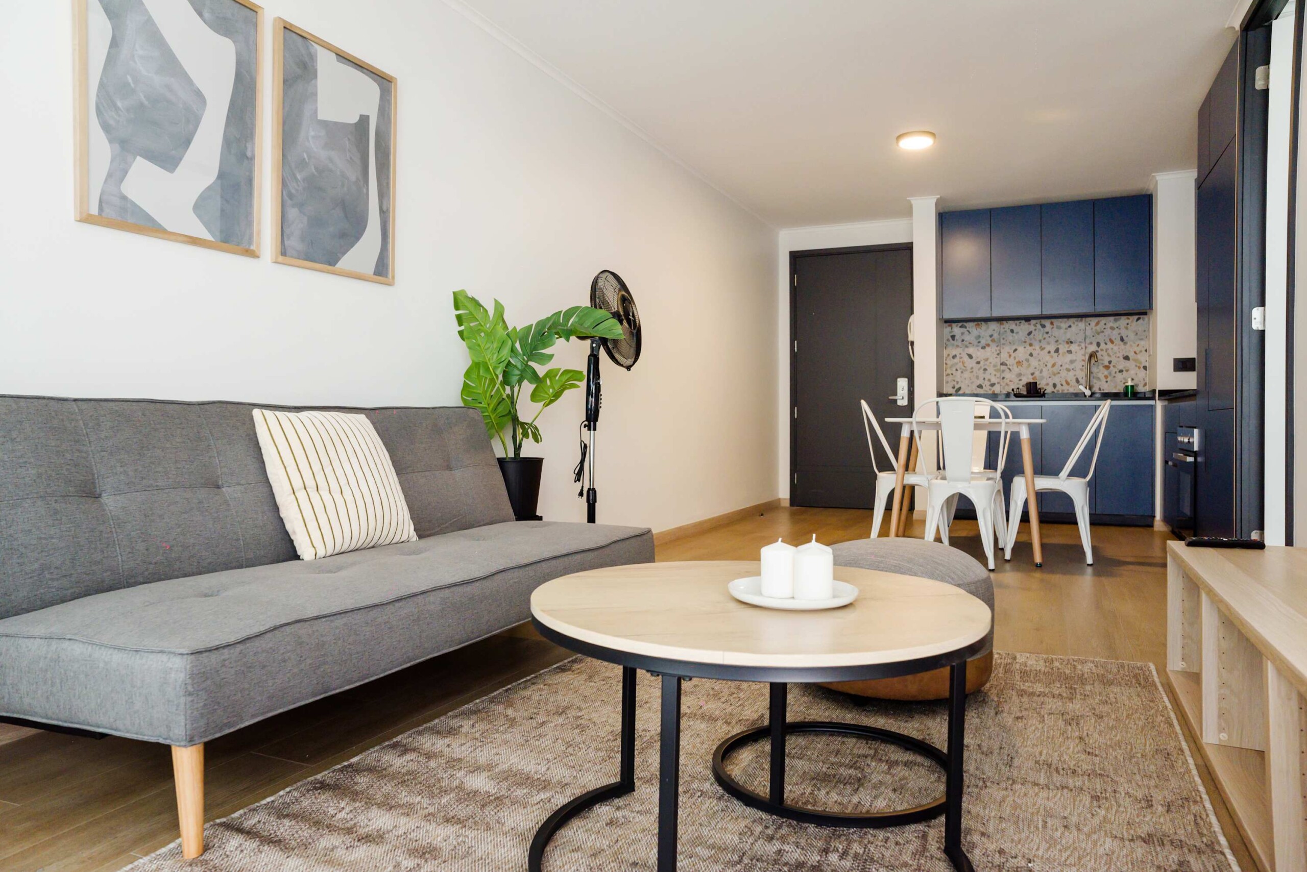 Step into this stylish Las Condes apartment, where modern comfort meets cozy charm. The open-plan living area invites relaxation, featuring a plush sofa bed and a sleek TV for entertainment.