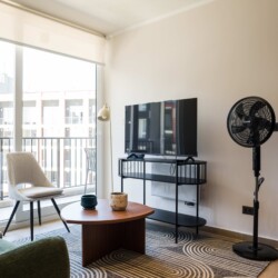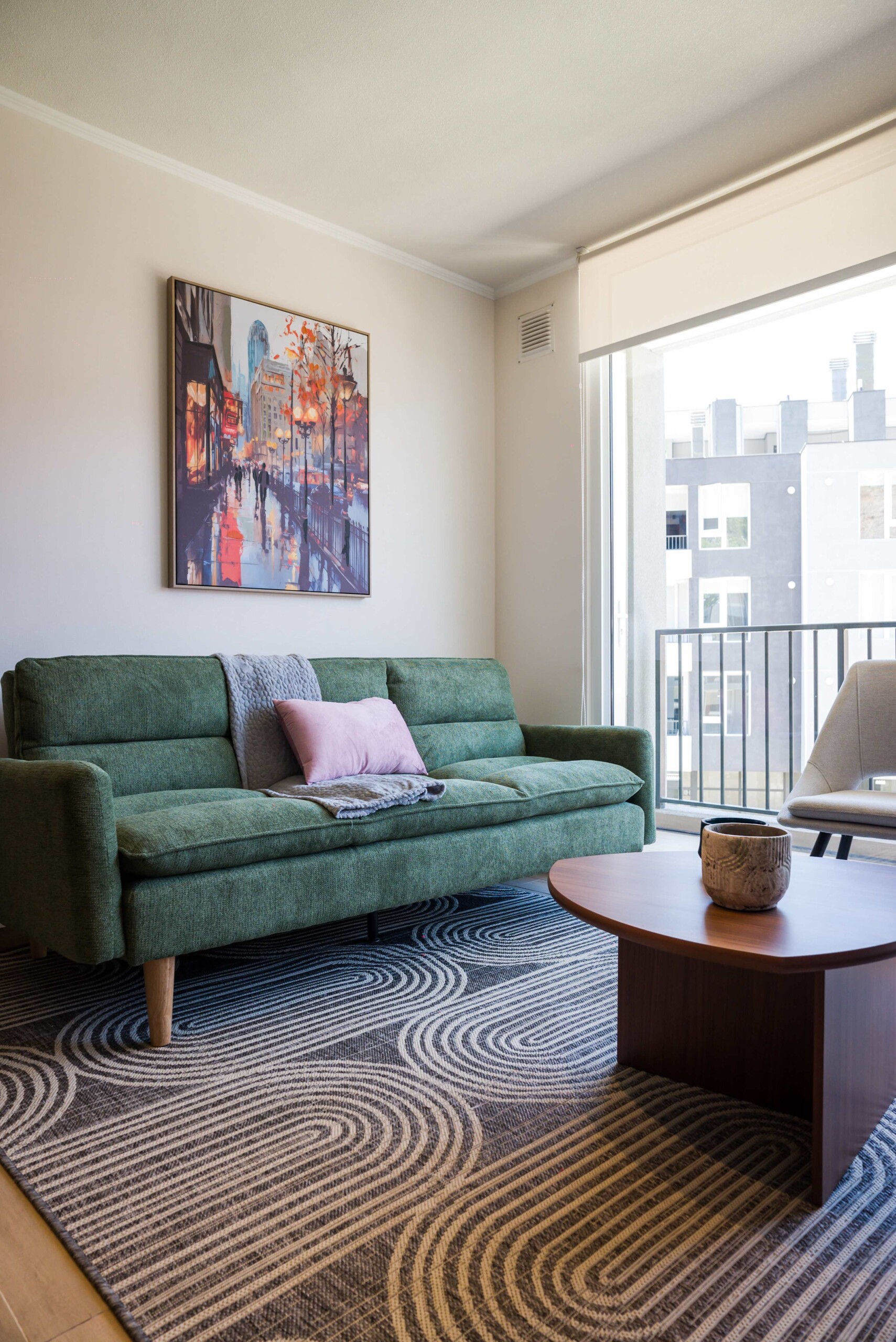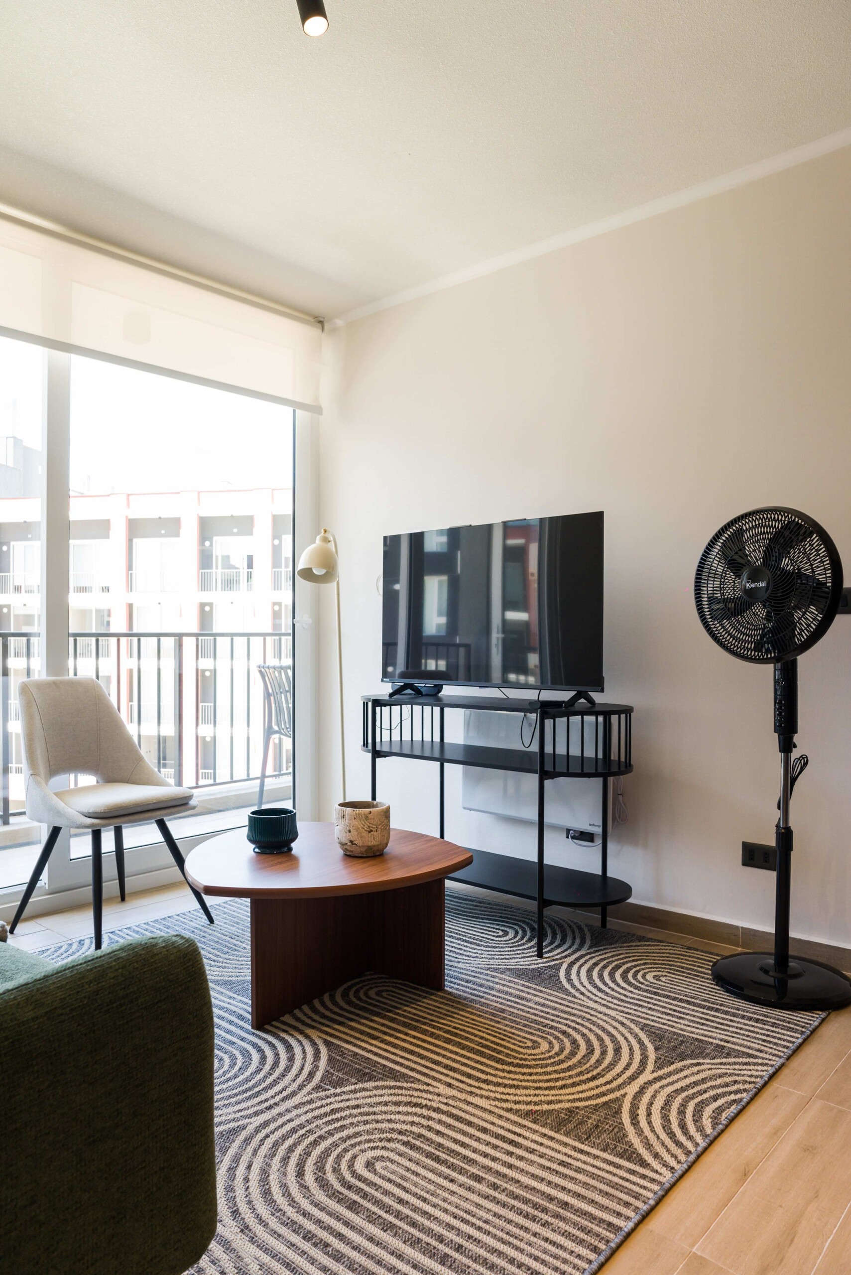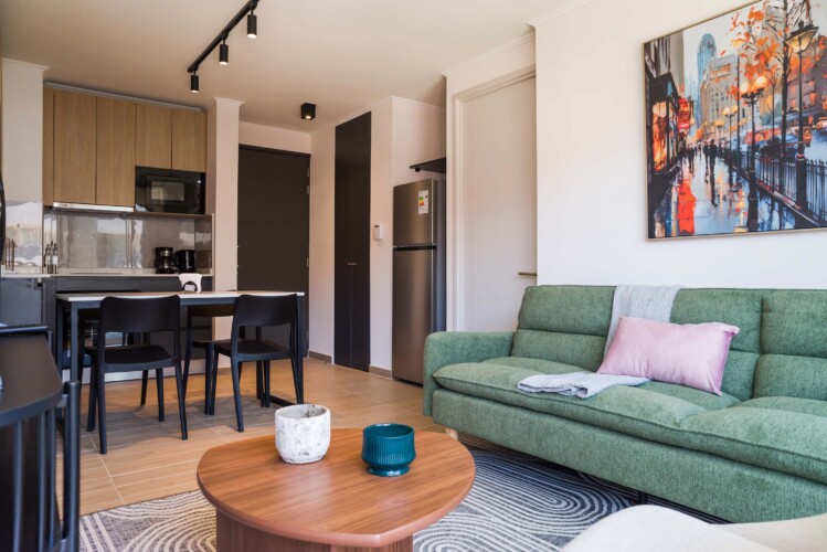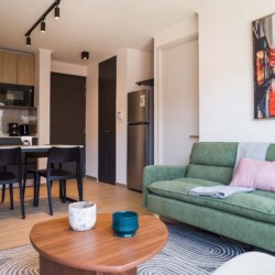 Step into this stylish Providencia apartment, where comfort meets modern elegance. The open-concept living area invites you to unwind, featuring cozy seating and a dining space perfect for shared meals.