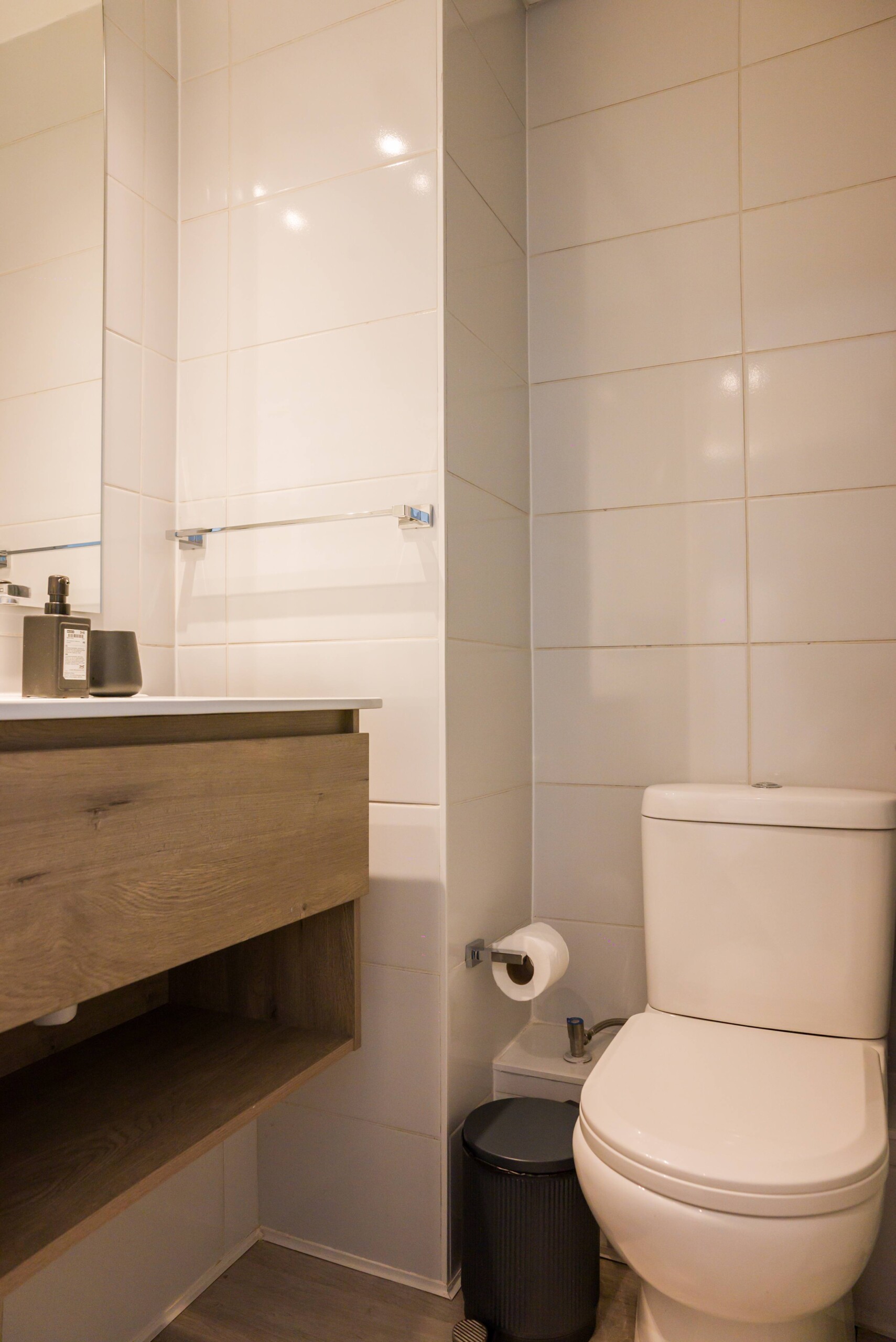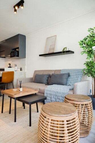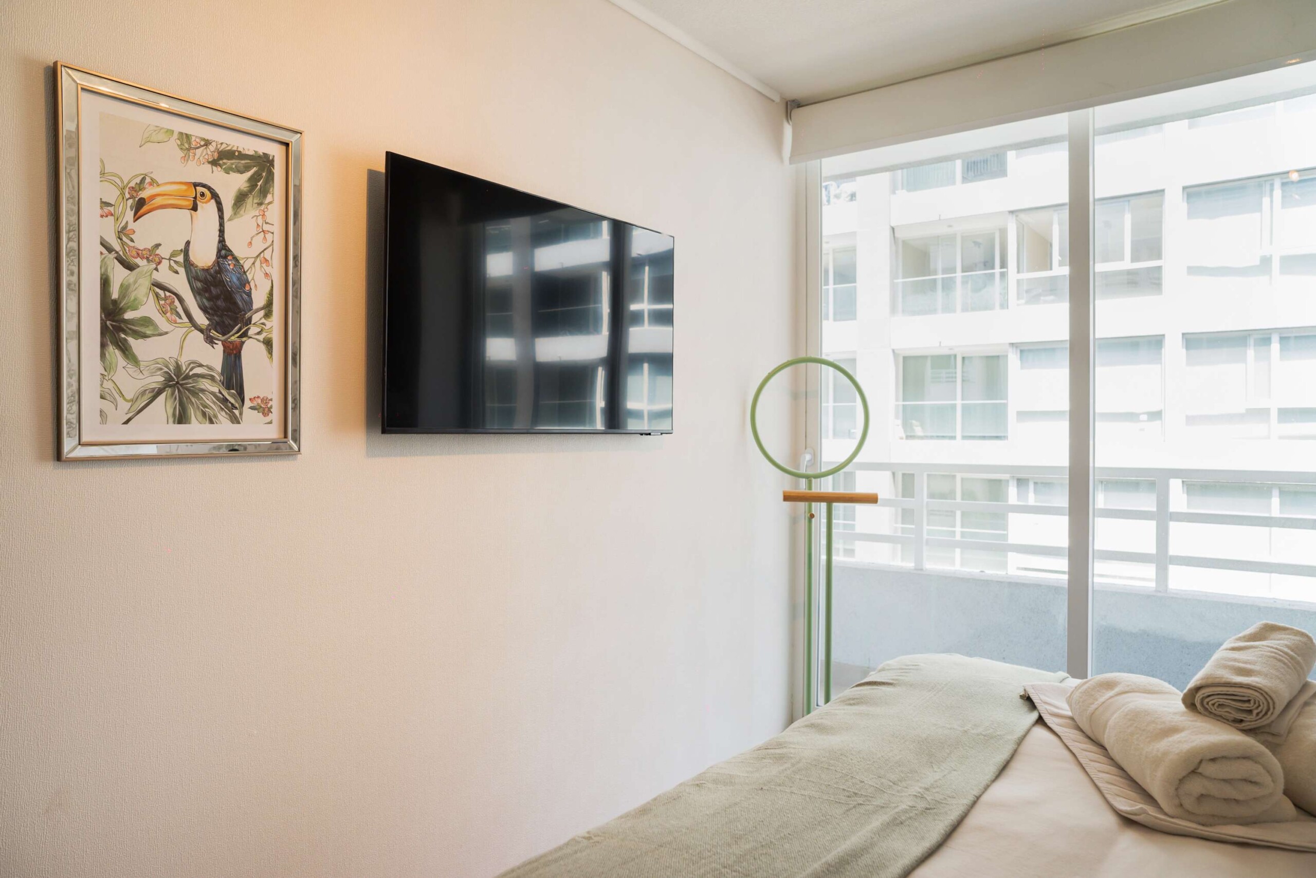 Step into this chic Santiago apartment, where modern comfort meets urban style. The open-plan living area welcomes you with a cozy sofa bed, perfect for an extra guest, and a flat-screen TV with cable for entertainment.