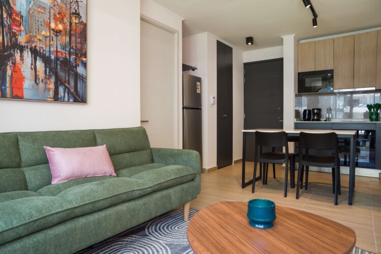 Step into this stylish Providencia apartment, where comfort meets modern elegance. The open-concept living area invites you to unwind, featuring cozy seating and a dining space perfect for shared meals.