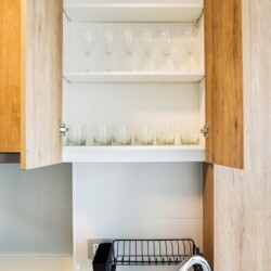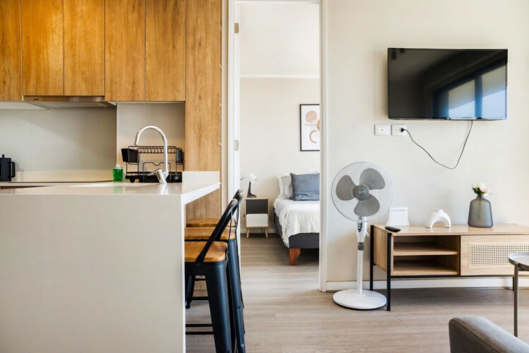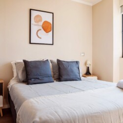 The apartment’s airy ambiance and thoughtful amenities create a welcoming retreat for up to five guests.