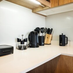 – **Kitchen**: Fully equipped with cookware, dishes, and a coffee maker for your morning brew.