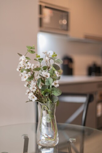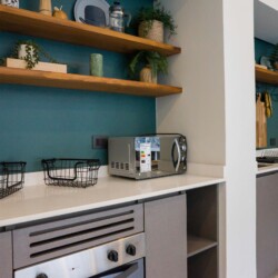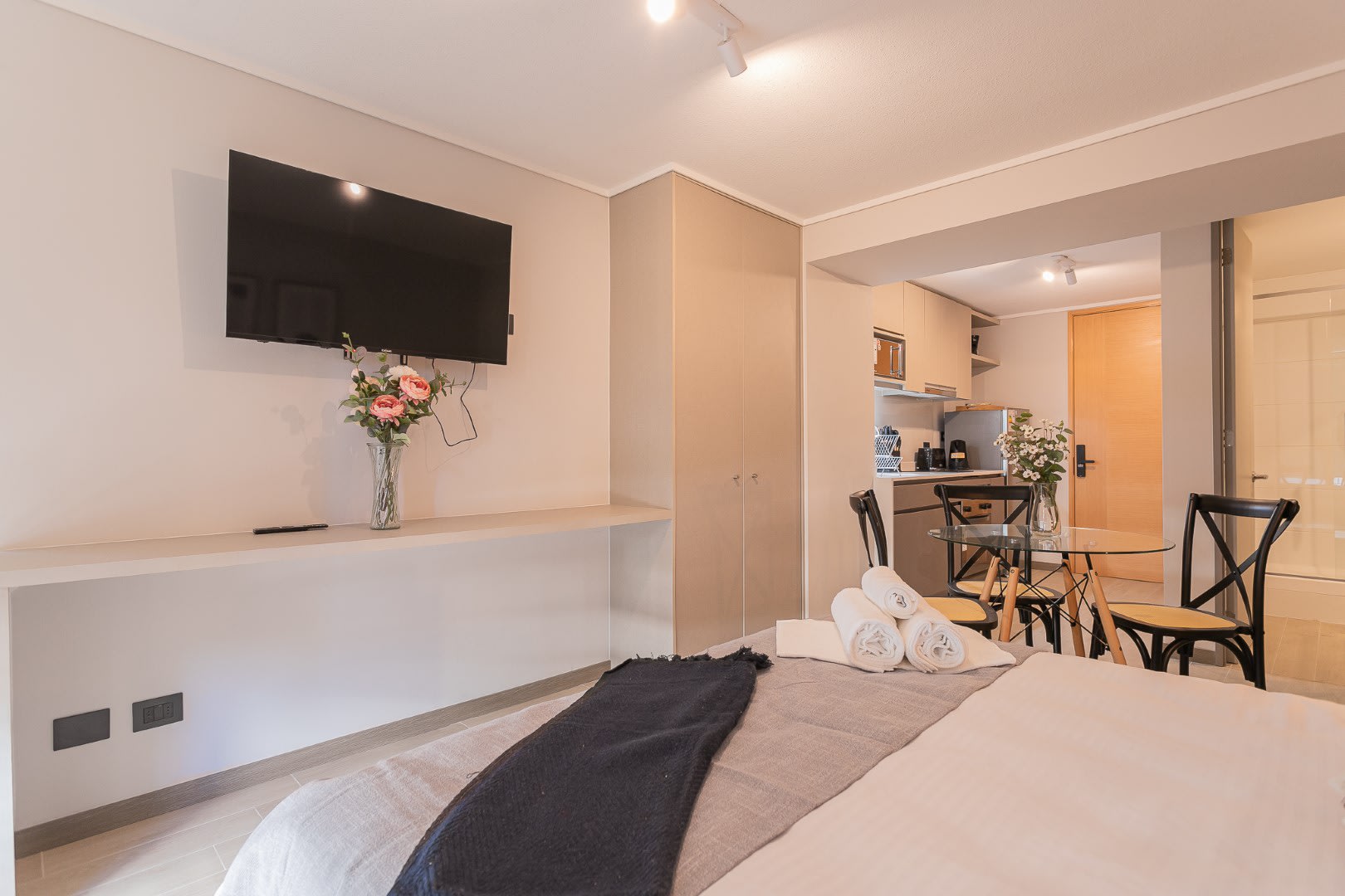 The studio’s modern design and thoughtful amenities create a warm, inviting ambiance.