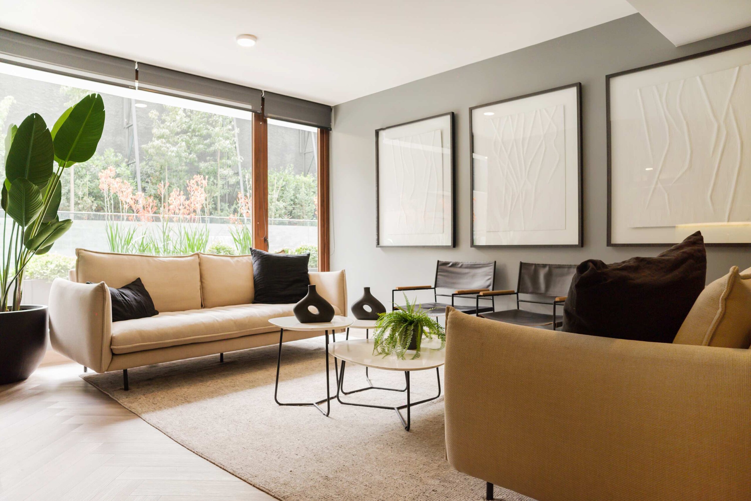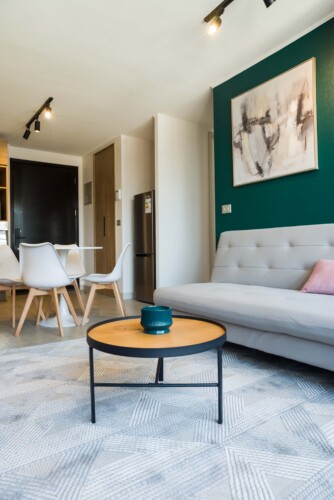 – **Living Area**: Bright and inviting, featuring a plush sofa that doubles as a bed, ideal for an extra guest.
