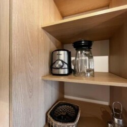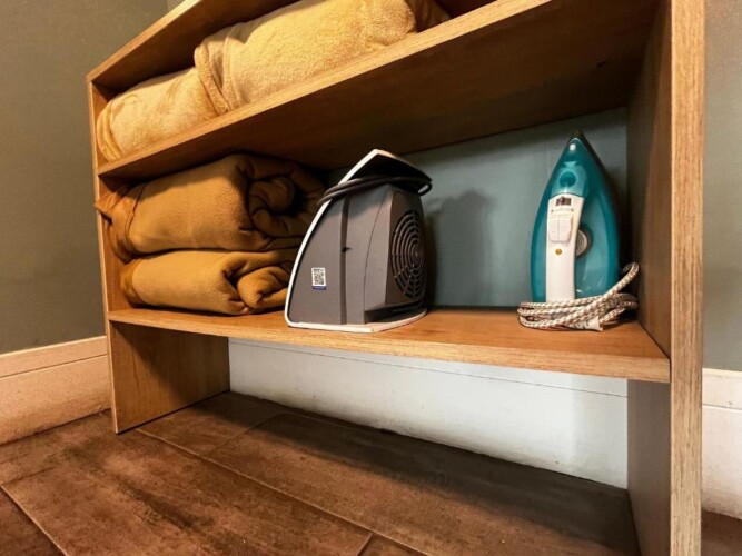 – **Sleeping Arrangements**: A plush bed promises restful nights, complemented by ample storage with hangers for your convenience.