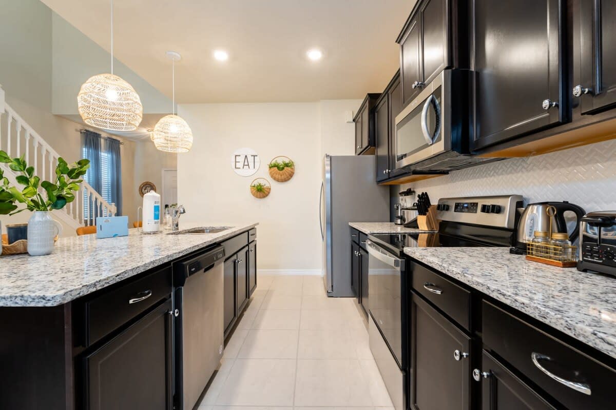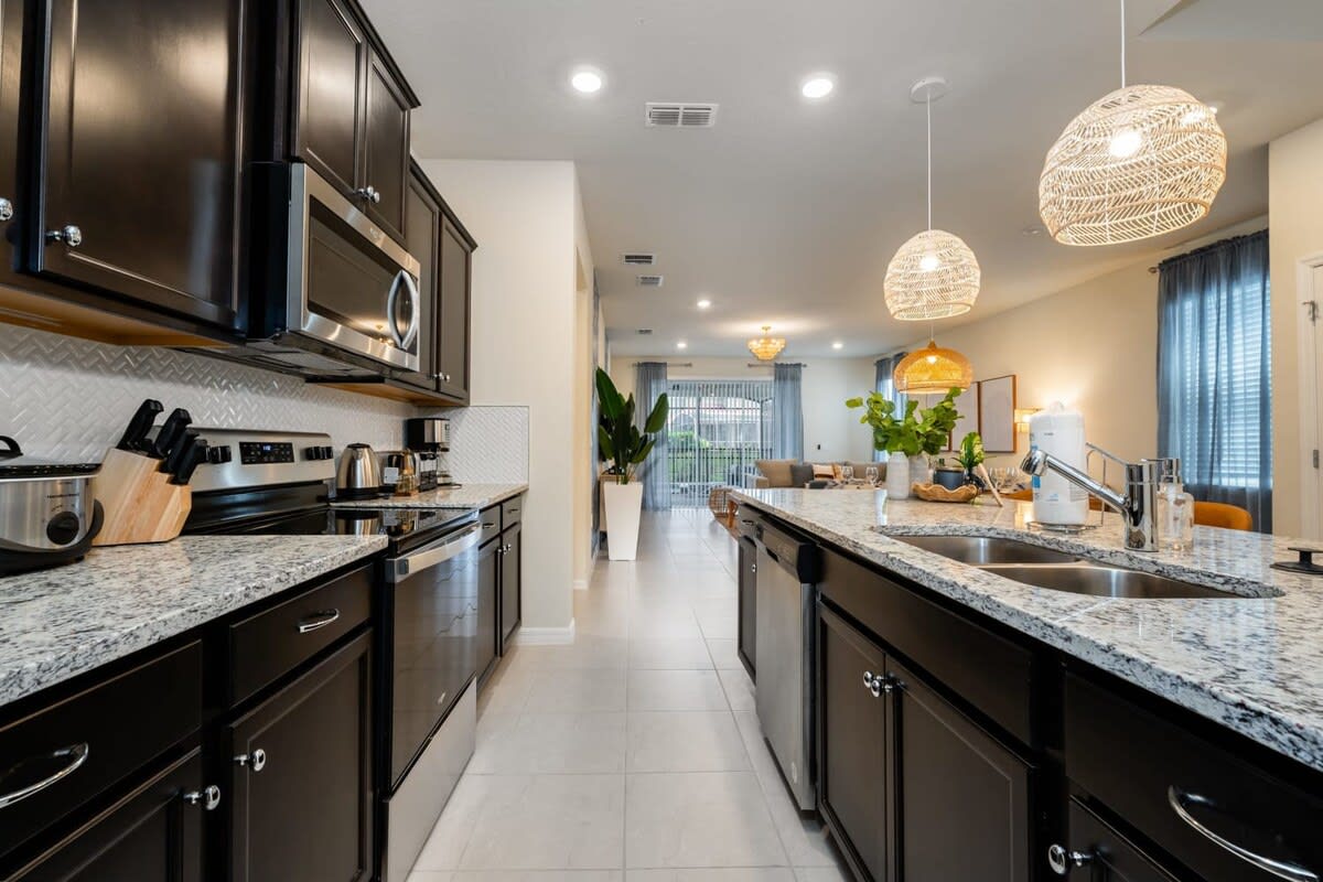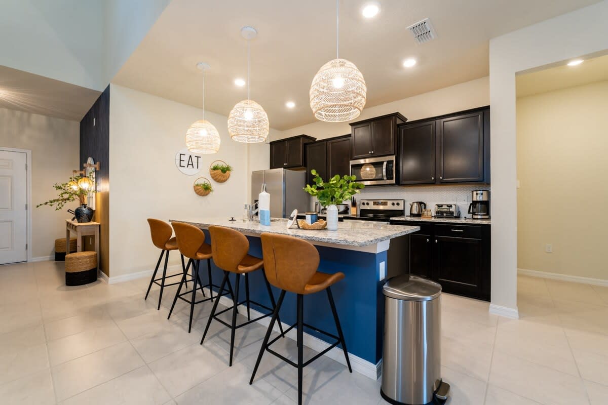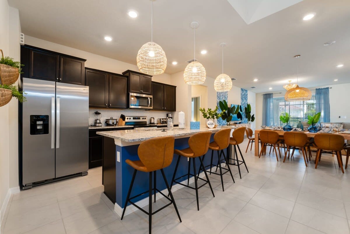 Looking for the perfect Orlando retreat to celebrate exciting milestones or to spend a fun and relaxing vacation with family and friends to build memories? We would love to invite you to enjoy our stunning 7-bedroom home at Windsor Island Resort, located in the Davenport area, just minutes away from Orlando’s top attractions, including Walt Disney World, Universal Studios, ESPN Wide World of Sports, and Sea World. The family room and opened kitchen are perfect for gathering the whole family and having a wonderful time.