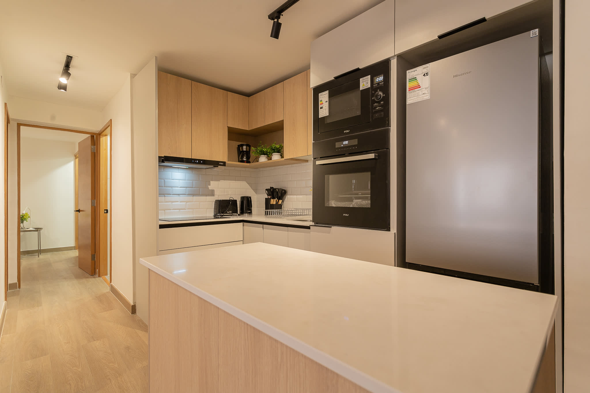 The contemporary design, complemented by large windows, floods the space with natural light, creating an airy and inviting ambiance. The fully equipped kitchen, featuring modern appliances and ample counter space, is ideal for preparing delicious meals.