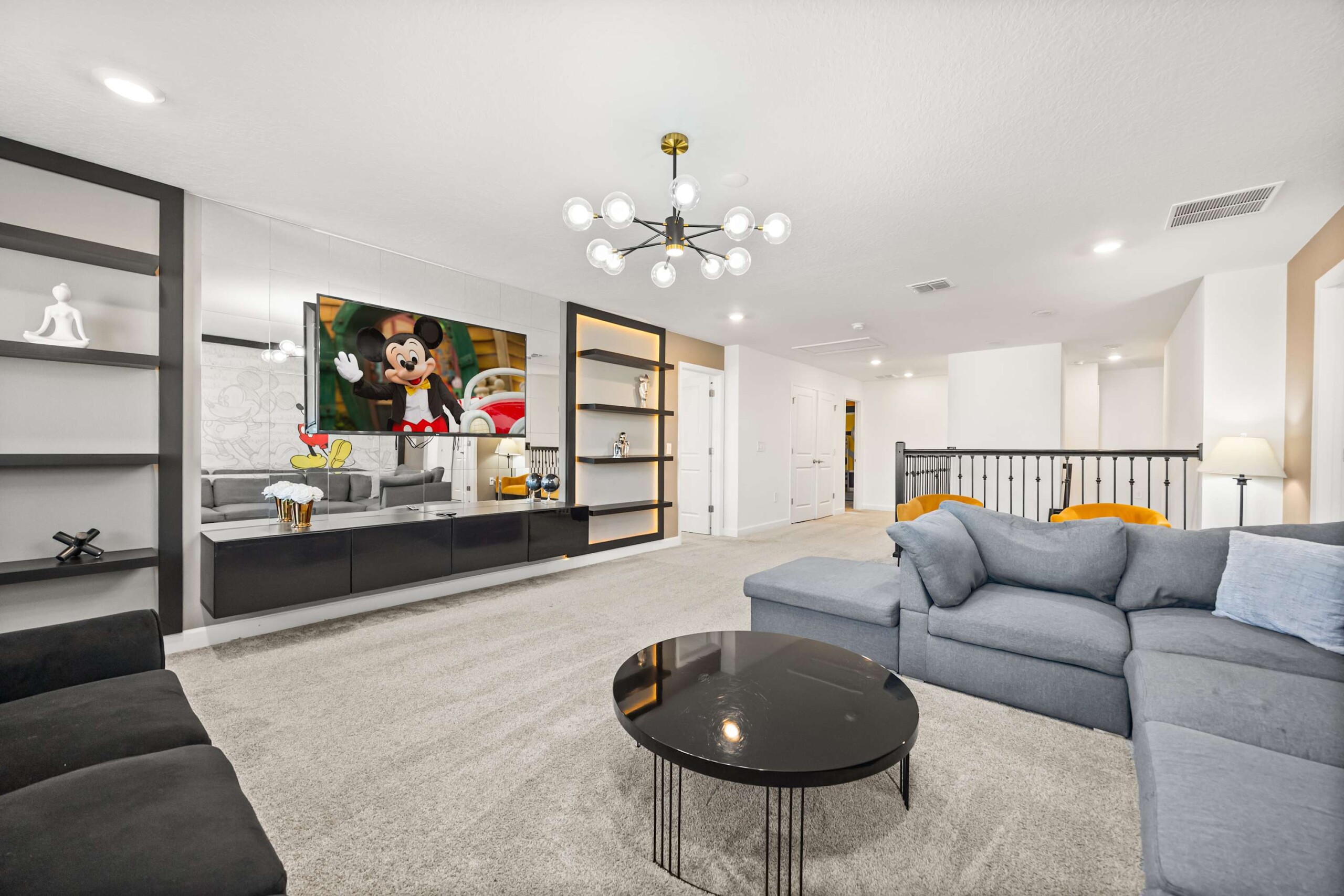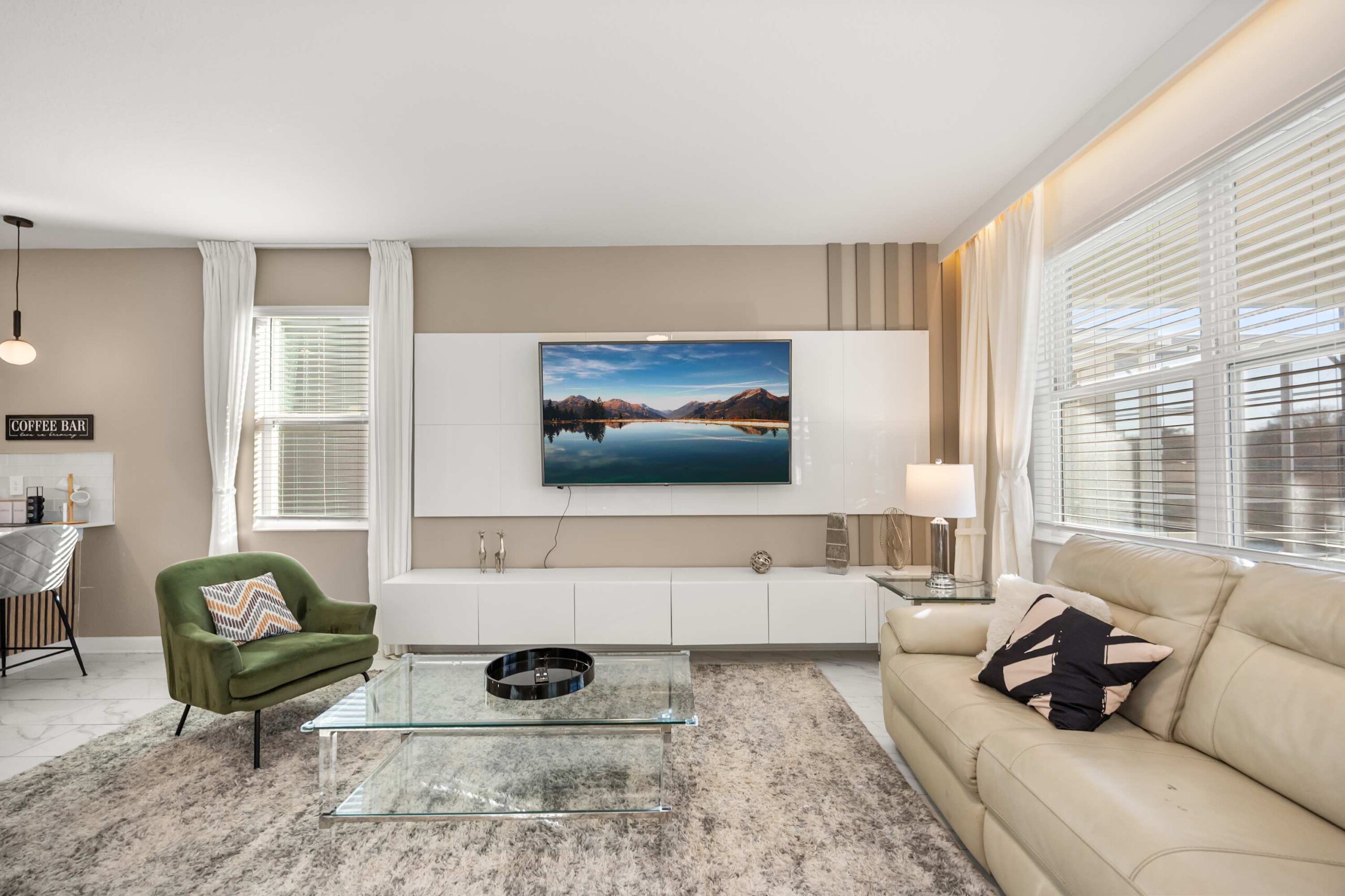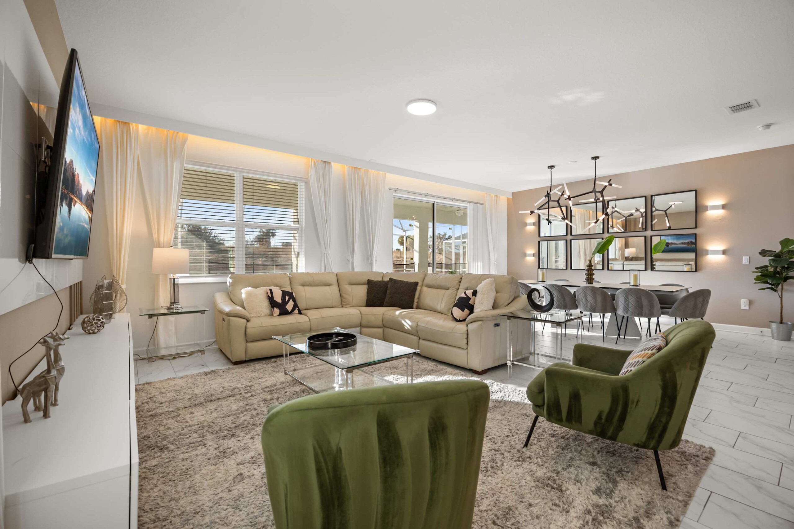 Step into this spacious Davenport villa, designed for comfort and style, perfect for large groups of up to 18 guests. Enjoy the seamless flow from room to room, starting with the open-concept living area featuring plush seating and a large TV.
