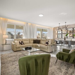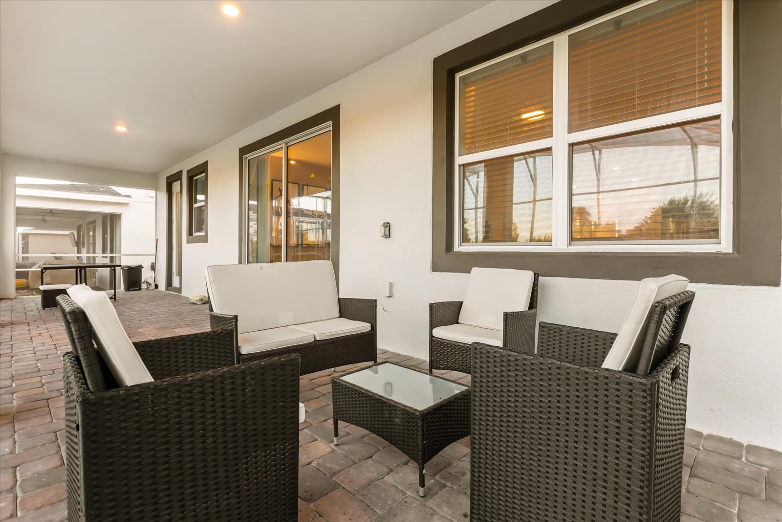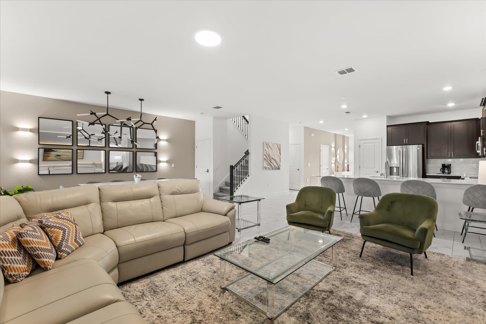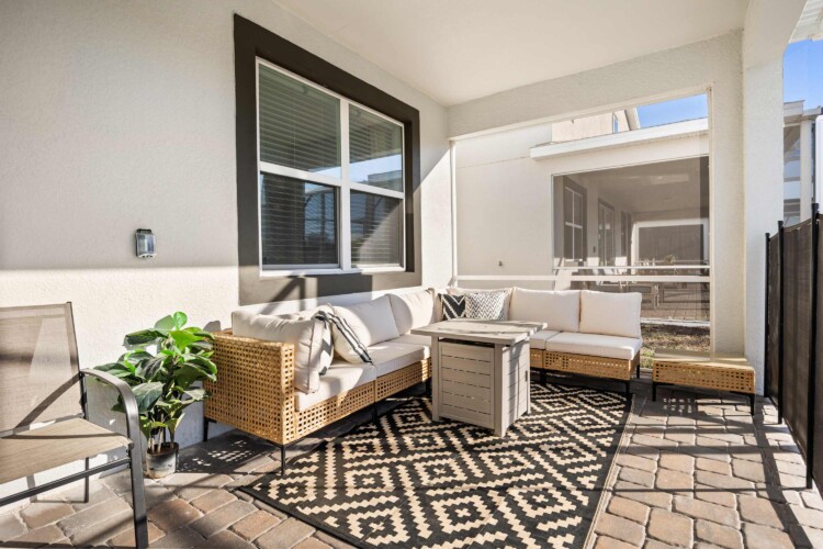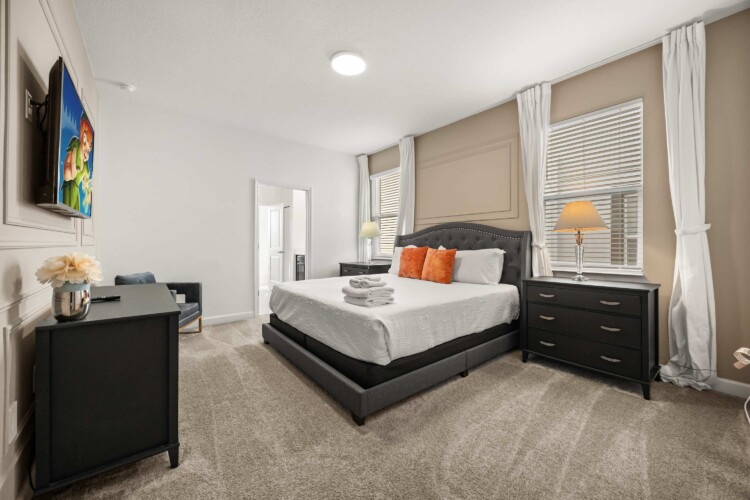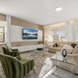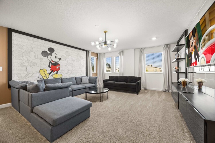 Step into this spacious Davenport villa, designed for comfort and style, perfect for large groups of up to 18 guests. Enjoy the seamless flow from room to room, starting with the open-concept living area featuring plush seating and a large TV.