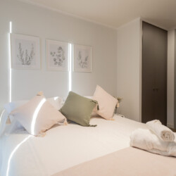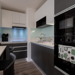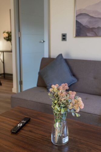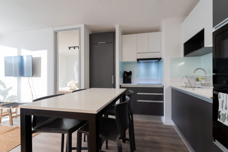 – **Bedrooms:** The primary bedroom offers a serene retreat with a comfortable queen-sized bed and ensuite bathroom. The second bedroom is thoughtfully designed with two single beds, ideal for children or friends. An additional sleeping arrangement is available in the living area, ensuring a restful night for all guests.
