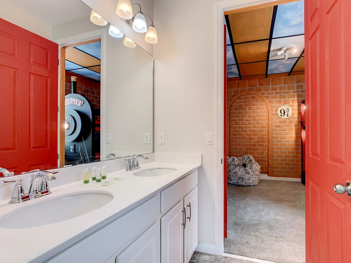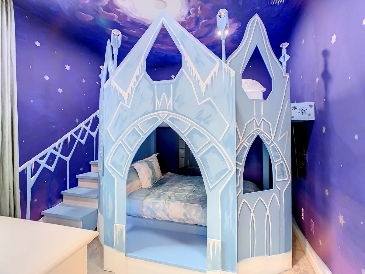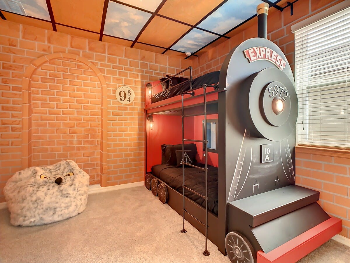This amazing 6 bedroom luxury home is located inside the Solara Resort. We’ve created the perfect space to live the Disney dream! We brought Frozen to life, this amazing room has a twin bed over a full bed, it is a MAGIC bedroom for kids. You can also take a trip to Hogwarts from our express platform 9 3/4. There is no age limit to enjoy our Harry Potter-themed room.