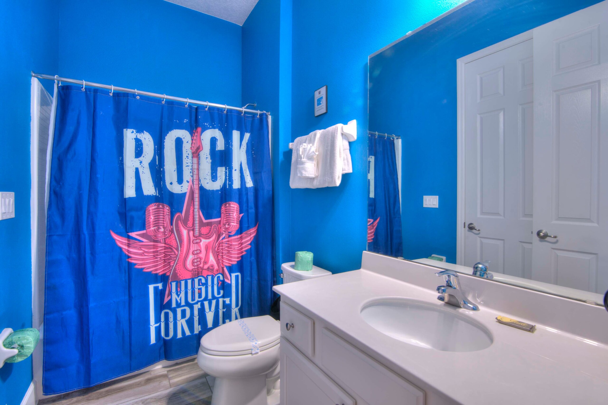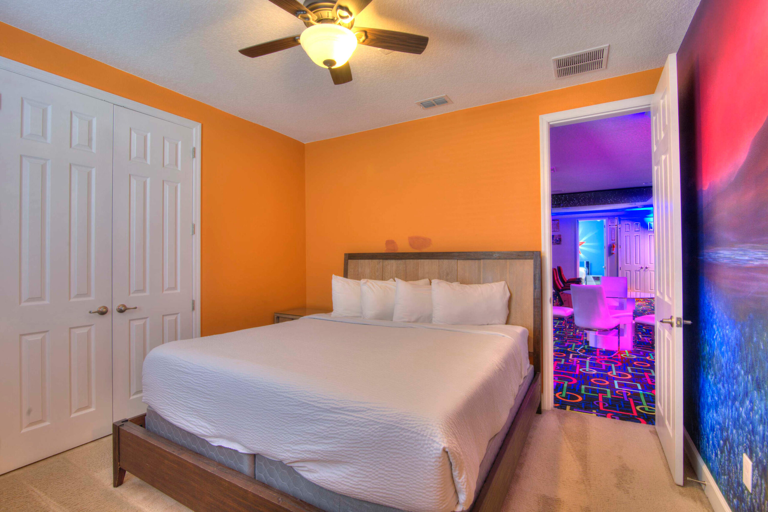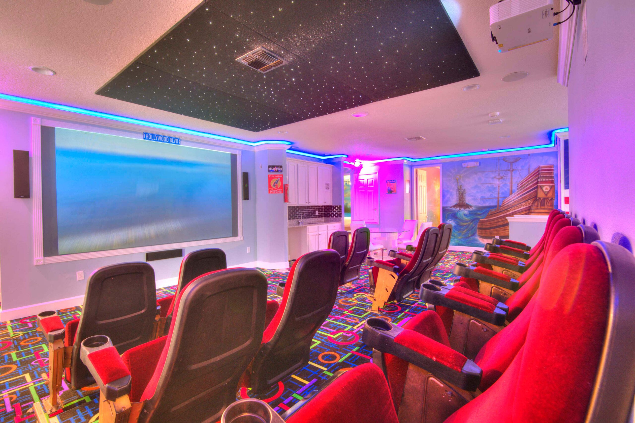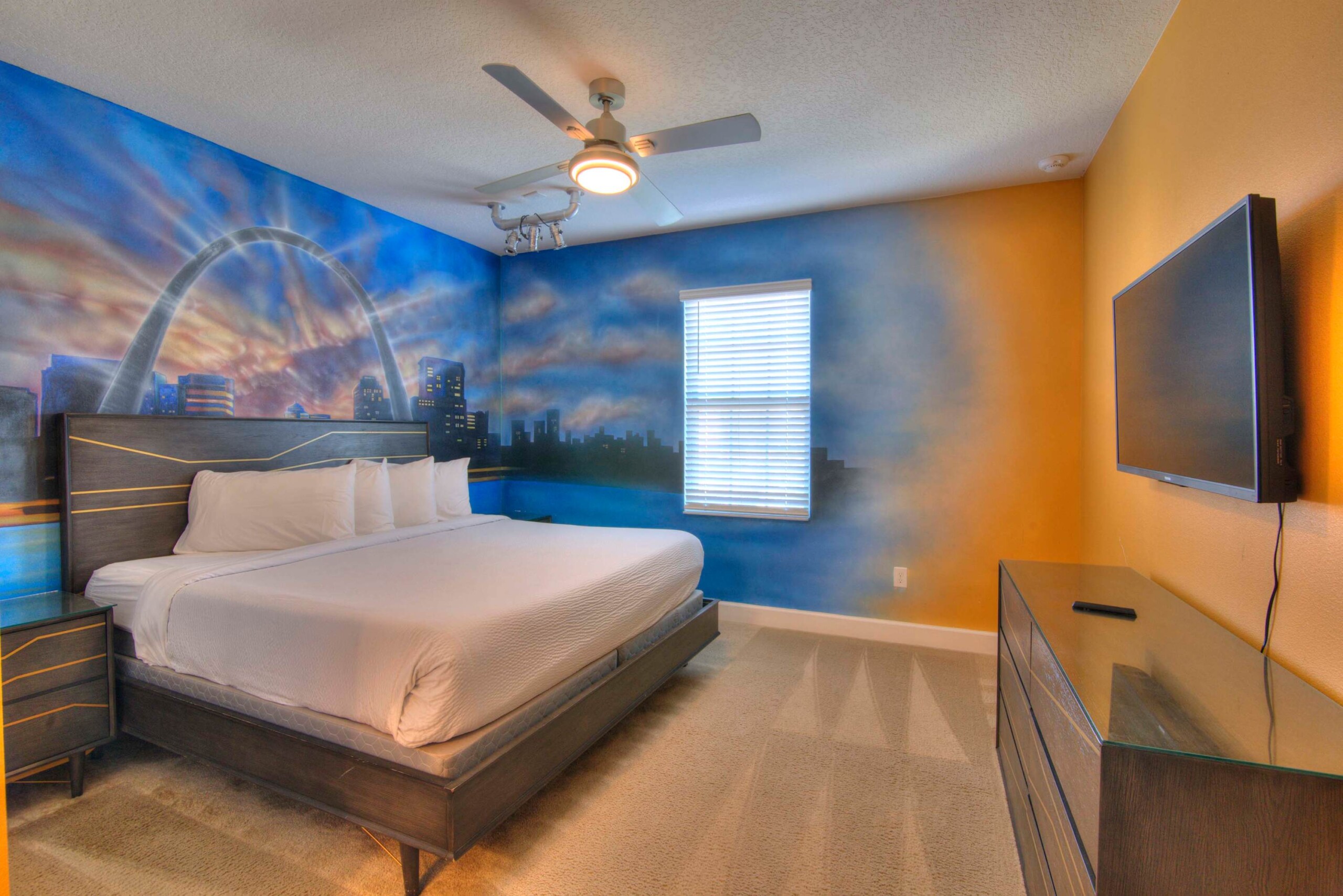 The bedrooms feature 14 famous American landmarks, along with 14.5 bathrooms. You will be amazed from the moment you walk through the doors making you feel like you are traveling on a scenic journey across America the beautiful. This premier home is soon to become a Landmark of its own! This magnificent 6750 sq. ft dream home has features unlike anything you have seen before. All bedrooms are custom-built and finished with the finest touches. With your own private two-lane bowling alley, you won’t even want to leave home. Other games include air hockey table, basketball hoops, pac ball, neo ball, epic arcade games, etc. The living room features 4K 200inch projector TV screen. The America-themed rooms take you on a journey to marvel at places like Las Vegas, Washington DC, and much much more. The Washington D.C., Las Vegas, and New York rooms are on the first floor. The house has 12 king beds and 2 kids’ rooms with full-over-full bunks x 2 per kid room. All bedrooms have flat screen TVs. There is a full-laundry room on each floor. There is plenty of open space for group gatherings (living room), with a massive Kitchen Island with additional chairs for the group to enjoy quality meals together. The Kitchen is fully equipped for the most discerning chef.