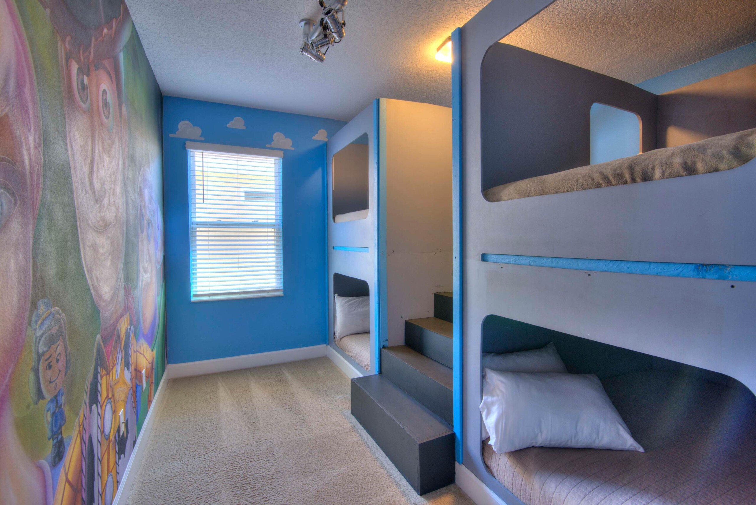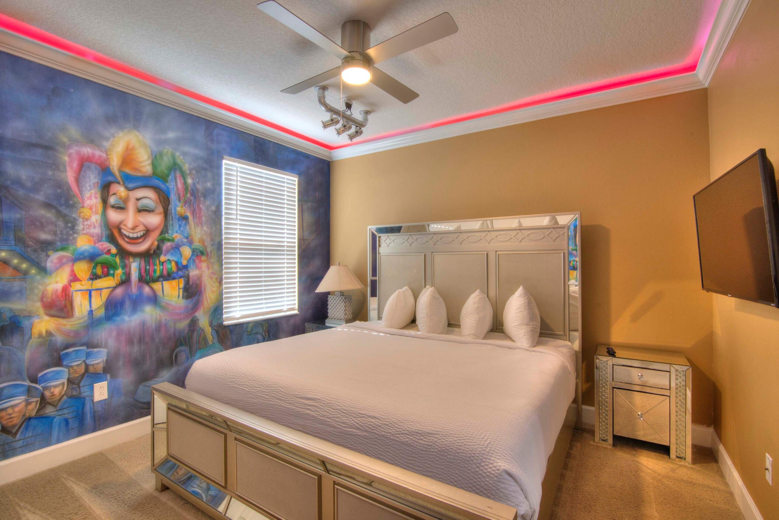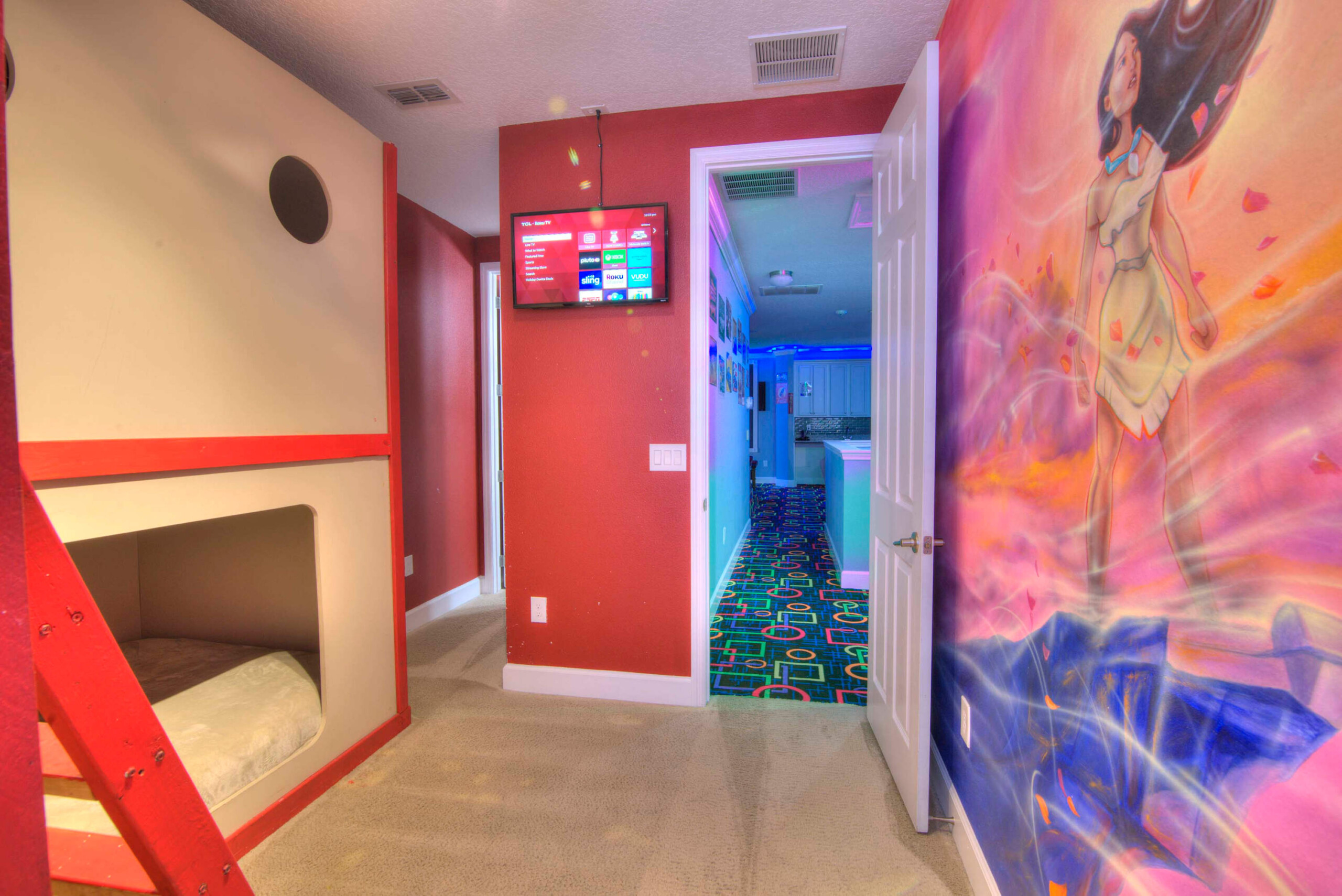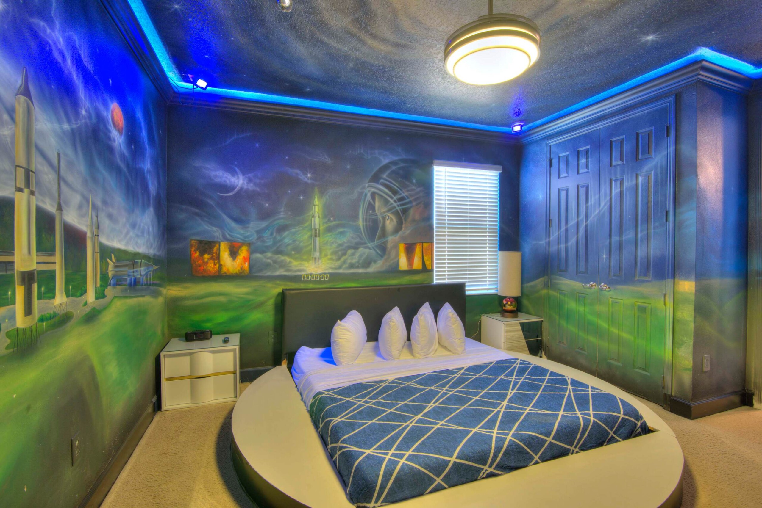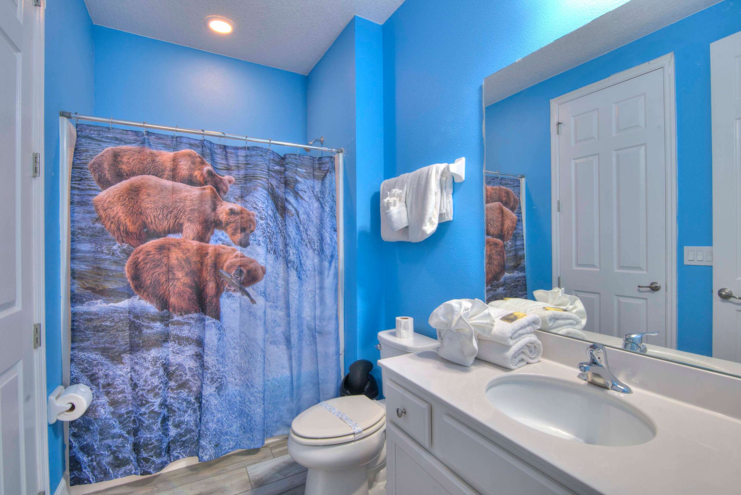 The bedrooms feature 14 famous American landmarks, along with 14.5 bathrooms. You will be amazed from the moment you walk through the doors making you feel like you are traveling on a scenic journey across America the beautiful. This premier home is soon to become a Landmark of its own! This magnificent 6750 sq. ft dream home has features unlike anything you have seen before. All bedrooms are custom-built and finished with the finest touches. With your own private two-lane bowling alley, you won’t even want to leave home. Other games include air hockey table, basketball hoops, pac ball, neo ball, epic arcade games, etc. The living room features 4K 200inch projector TV screen. The America-themed rooms take you on a journey to marvel at places like Las Vegas, Washington DC, and much much more. The Washington D.C., Las Vegas, and New York rooms are on the first floor. The house has 12 king beds and 2 kids’ rooms with full-over-full bunks x 2 per kid room. All bedrooms have flat screen TVs. There is a full-laundry room on each floor. There is plenty of open space for group gatherings (living room), with a massive Kitchen Island with additional chairs for the group to enjoy quality meals together. The Kitchen is fully equipped for the most discerning chef.