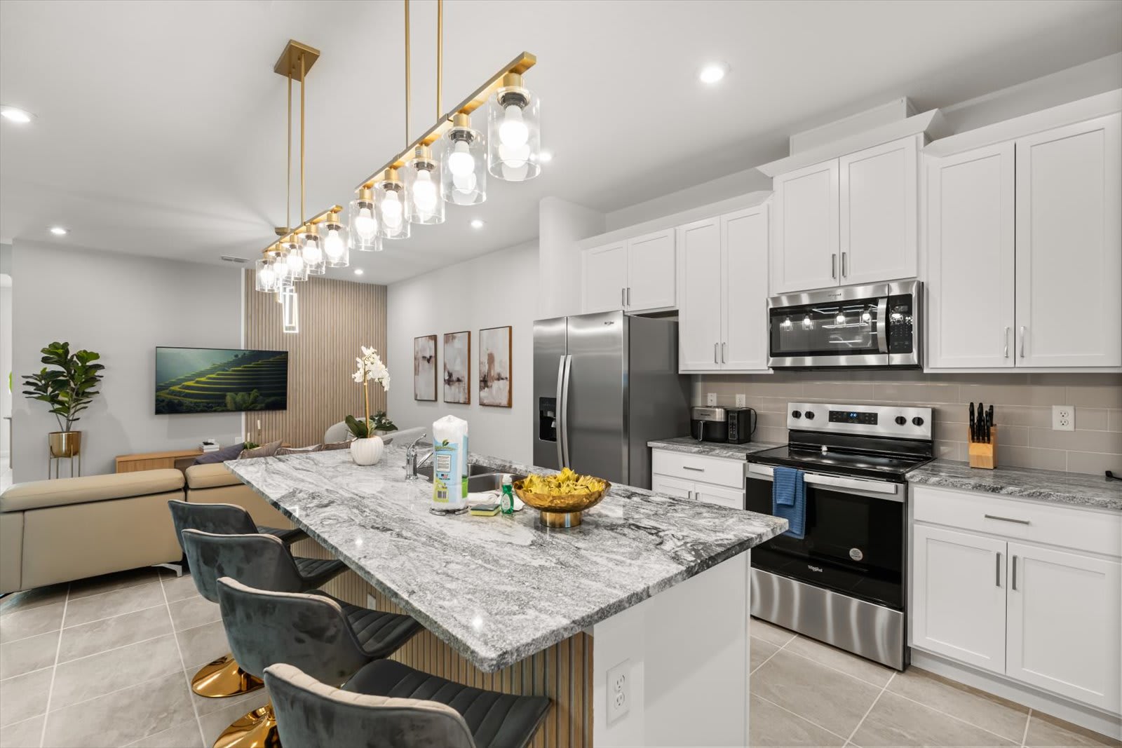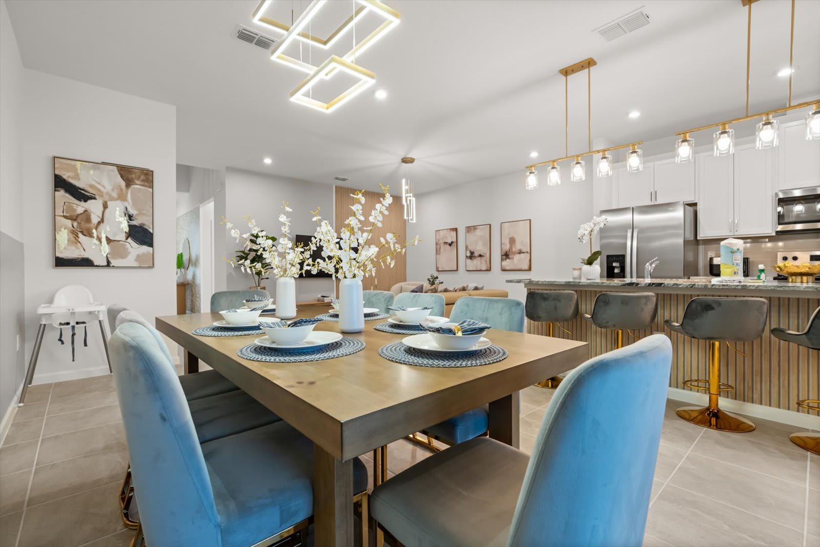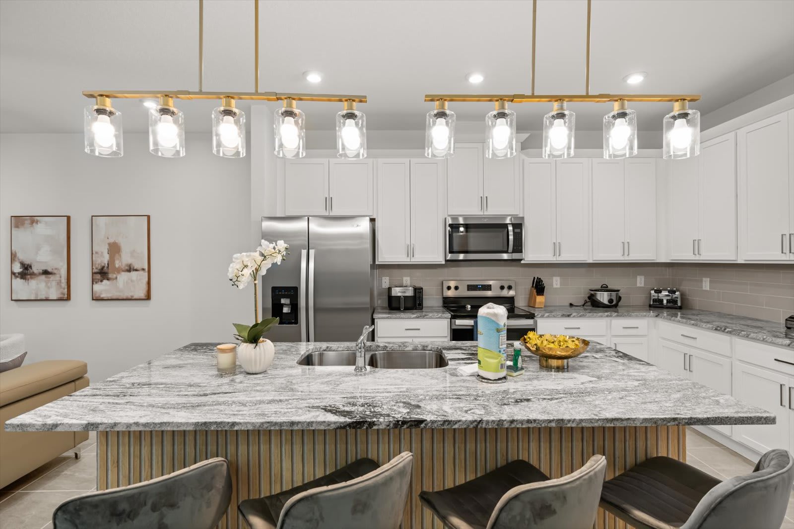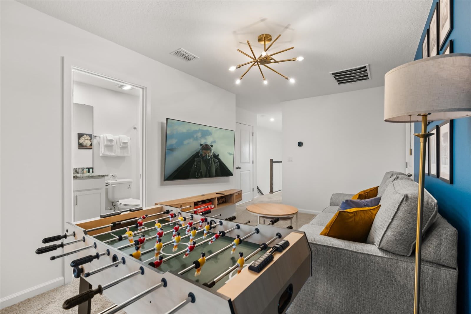 Step into a world of comfort and style in our Kissimmee villa, designed for relaxation and fun. The open-concept layout seamlessly connects the living room, dining area, and fully equipped kitchen, perfect for family gatherings. Enjoy the loft living room, featuring a large smart TV for entertainment. Retreat to four inviting bedrooms: a master suite with a queen bed and private bath, a king bed room, another with a queen, and a playful room with a trundle, twin, and full bed. Key amenities include air conditioning, a BBQ grill, and a private screened pool with a covered lanai. Unwind in style with plush bed linens, cable TV, and a coffee maker for your morning brew.