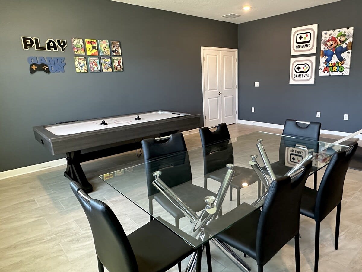 Game room β Air hockey, Marvel heroes pinball game, Kidβs Ms. Pacman arcade, jungle gym.