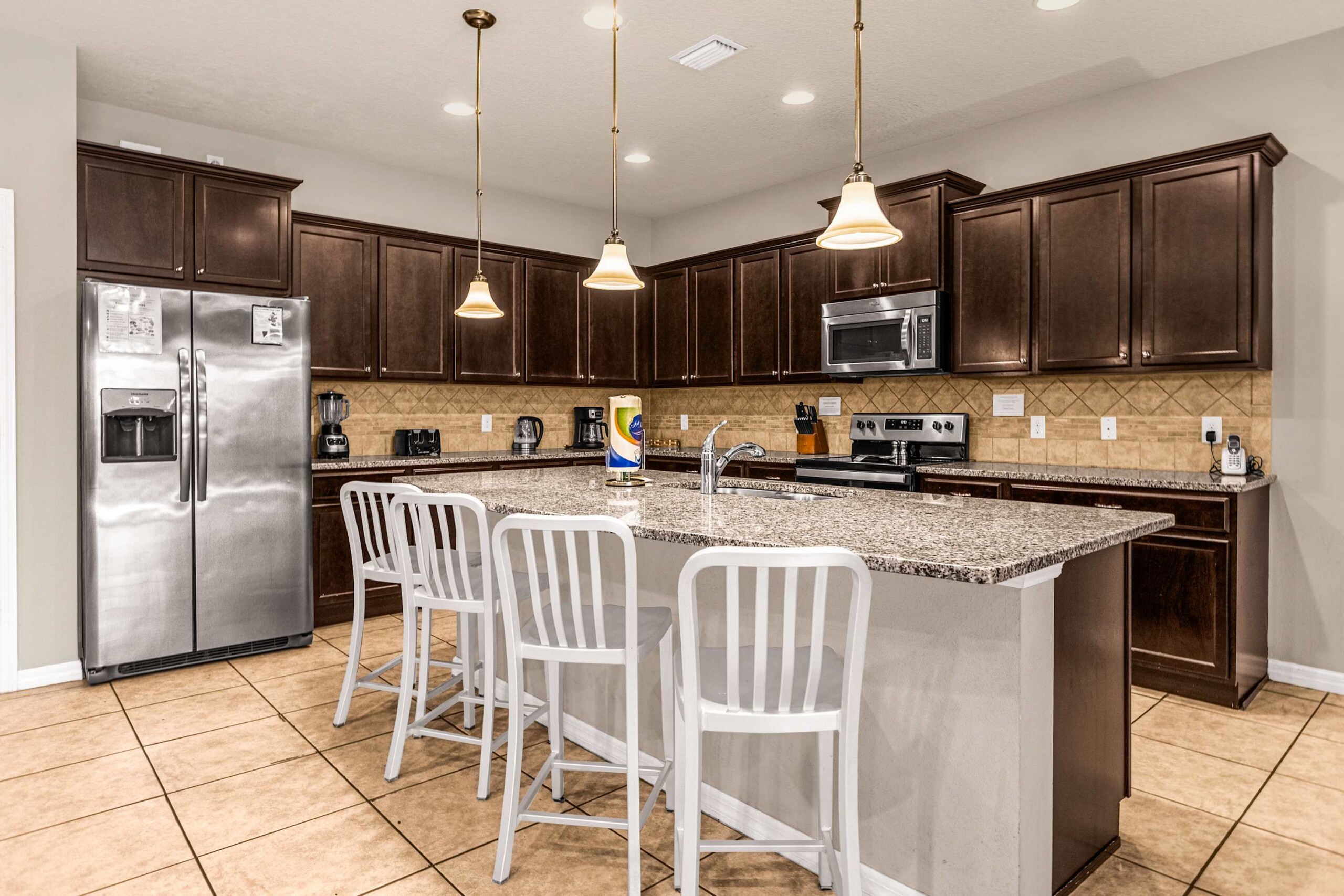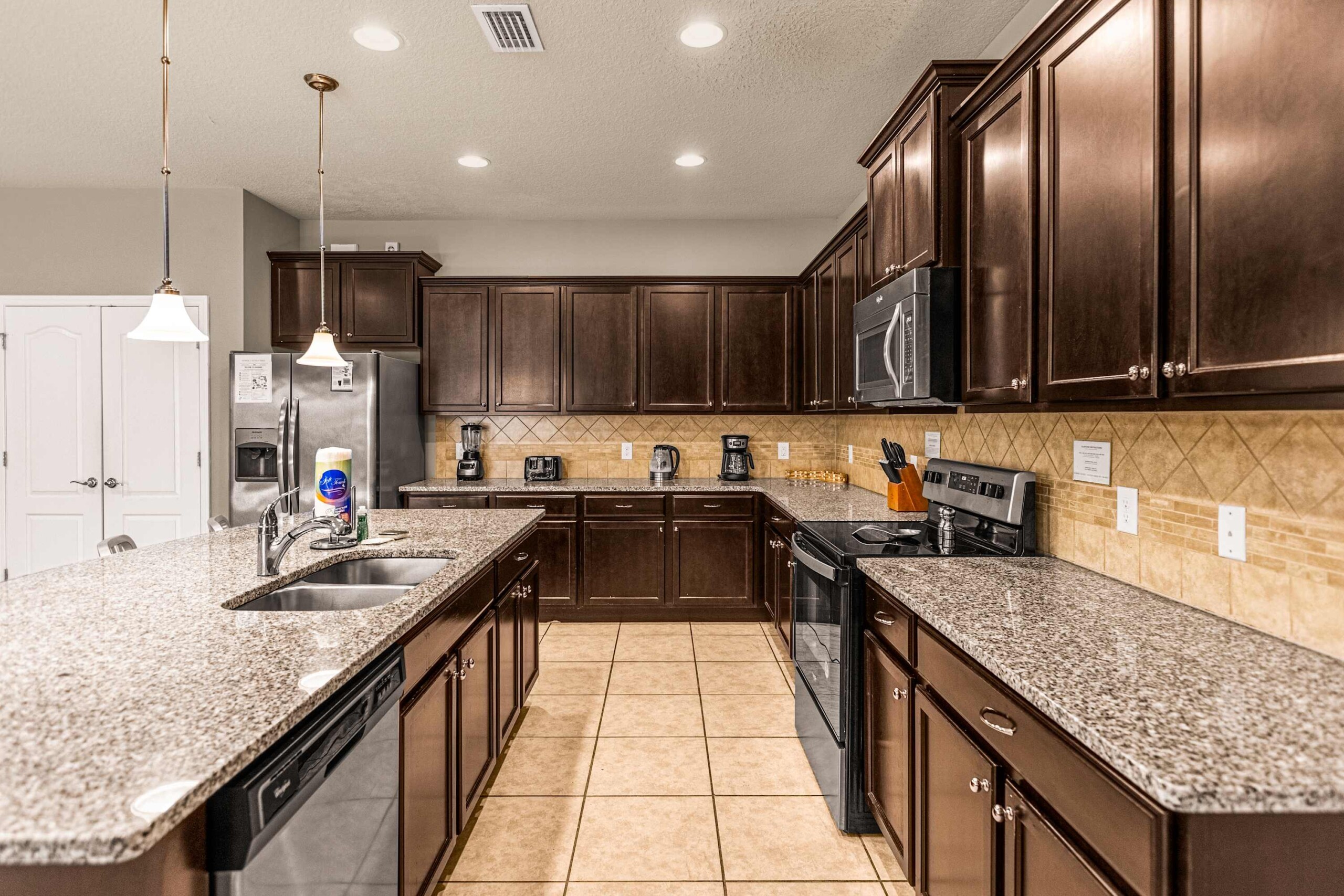 -A large fully equipped kitchen with stainless steel appliances, including range, microwave, dishwasher and granite counters / breakfast bar.