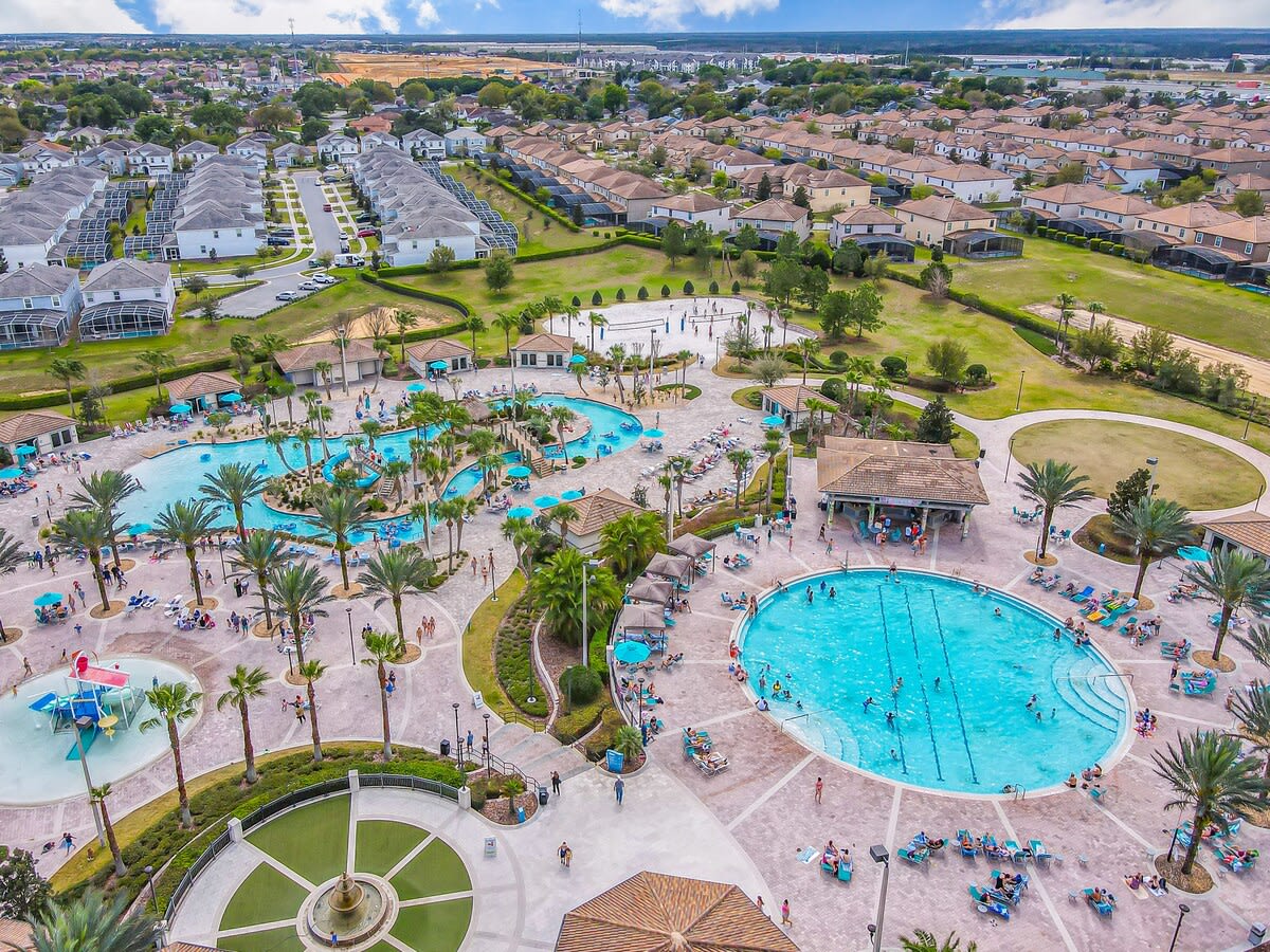 This luxurious amenity center is for homeowners in Lennar’s Champions Gate together with vacationing guests staying in the resort’s short term rental approved neighborhood, The Retreat at Champions Gate. Inside the 16,000+ sq. ft. | 1,500 m² clubhouse building you will find The Grille Room restaurant and bar, concierge desk, a movie theater, fitness center, game room, and more. Among the outdoor amenities are two temperature controlled pools, a lazy river, 2-story water slide, children’s water play structure, sand volleyball, rentable cabanas, poolside food and drink service, and the Tiki Bar. Separately, the community also features 7 tennis courts and the Champions Gate Country Club golf course.