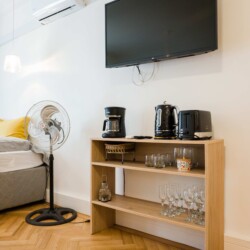 – Living Area: Open-plan space with a plush sofa bed and flat-screen TV, perfect for relaxation or additional sleeping. Tranquil space with a queen-sized bed and ample closet space with hangers.