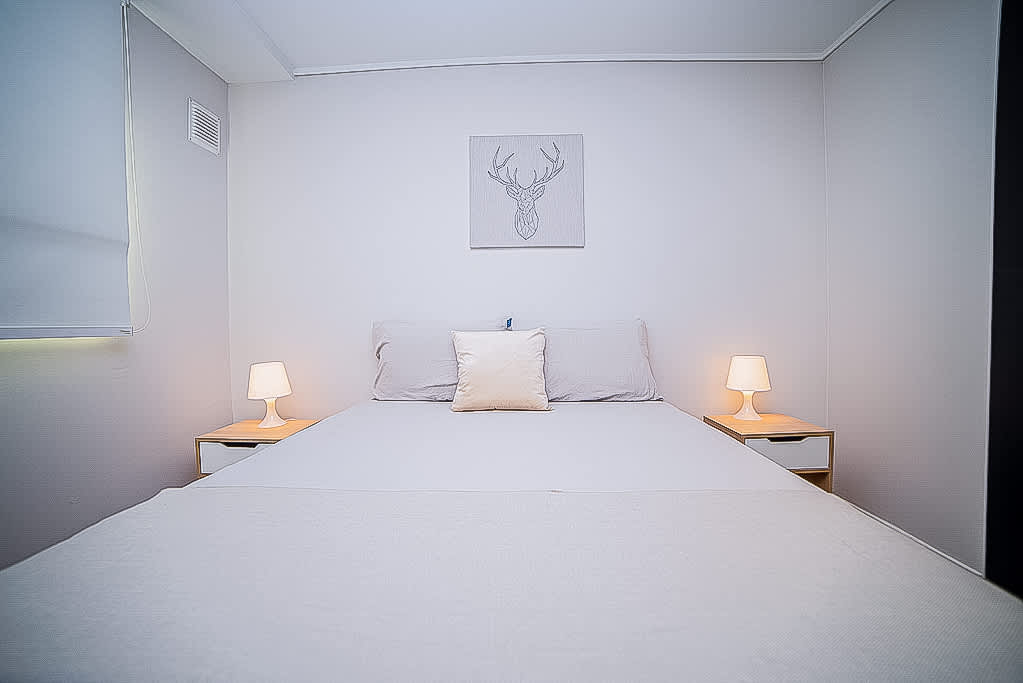 The master bedroom features a double bed, perfect for any of your companions, along with fresh sheets and towels.
