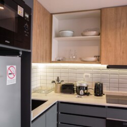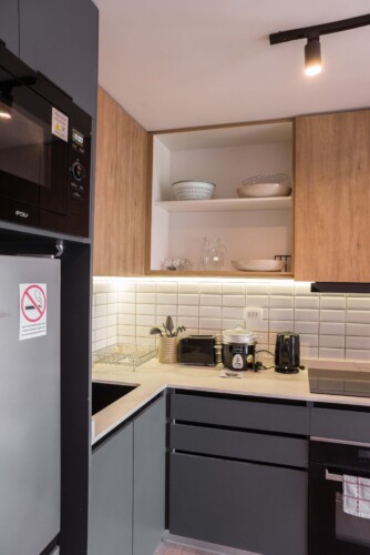 In the well-equipped kitchen, you’ll find all the necessary utensils to prepare your favorite meals and snacks. Enjoy dining in style in our charming dining area, which offers a stunning cityscape view, adding a touch of magic to your culinary experience.
