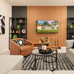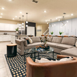 – A Great Room with a plush sofa, large flat-screen TV, and bar area.
