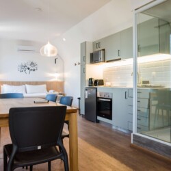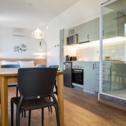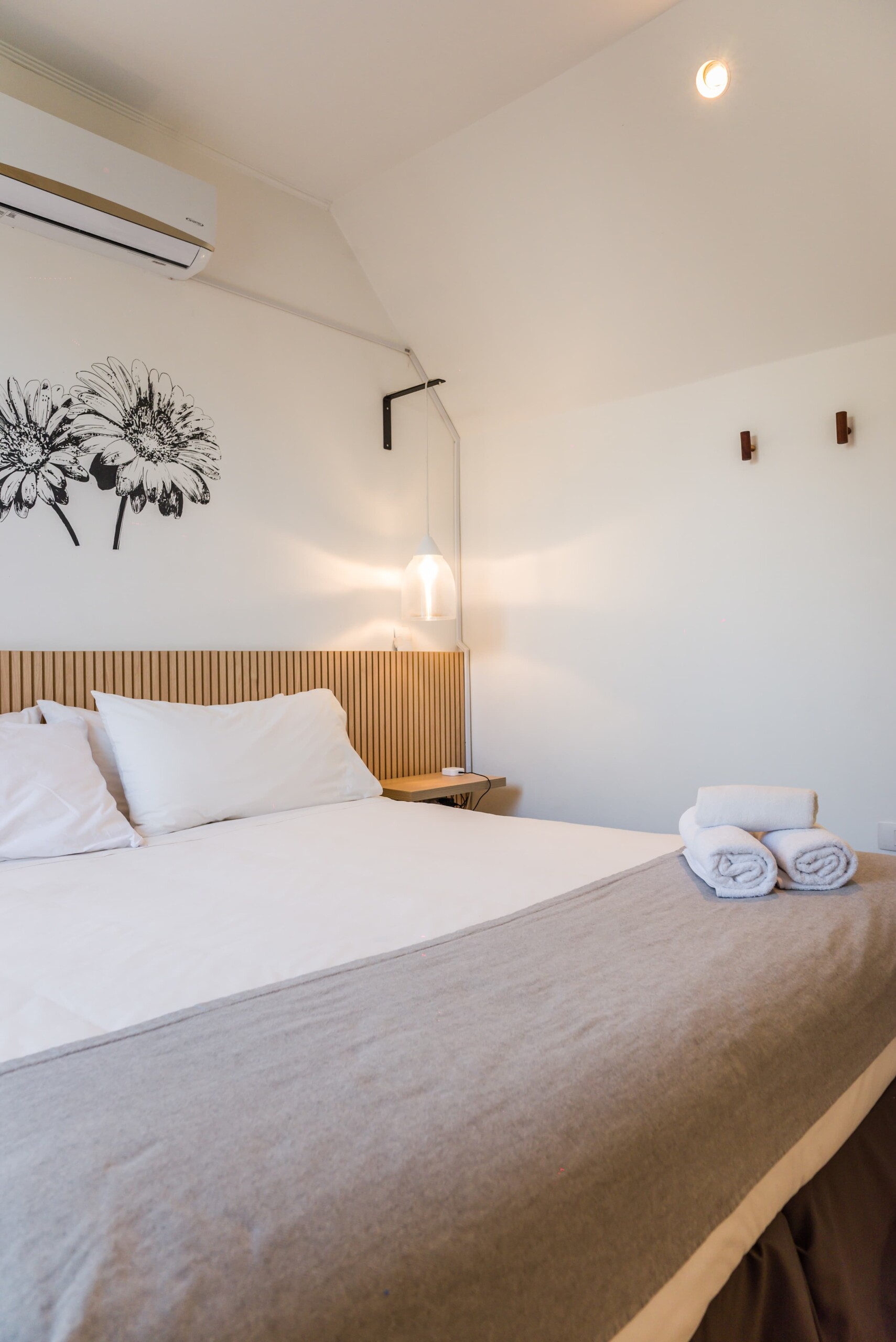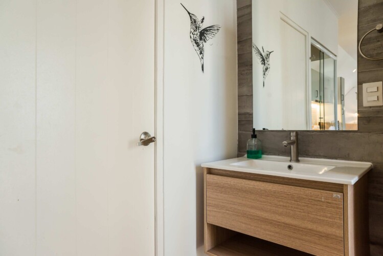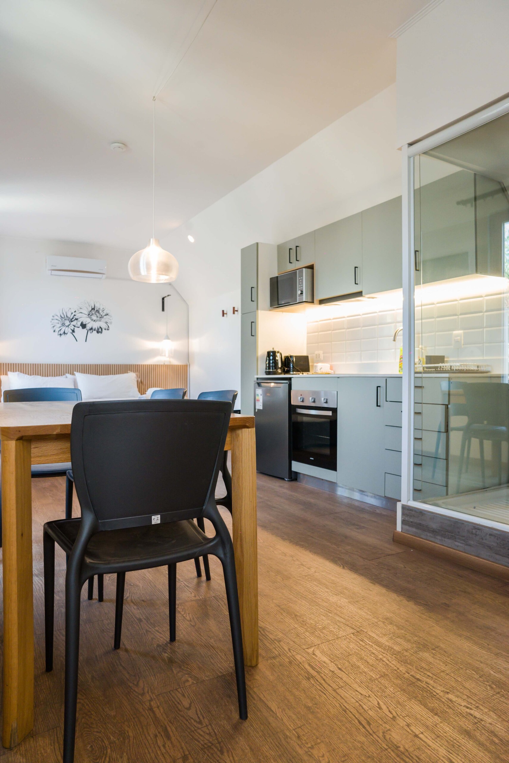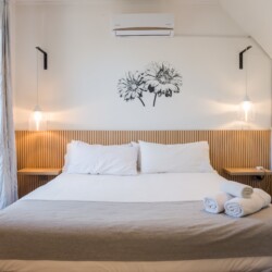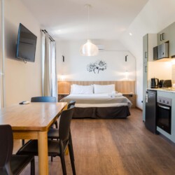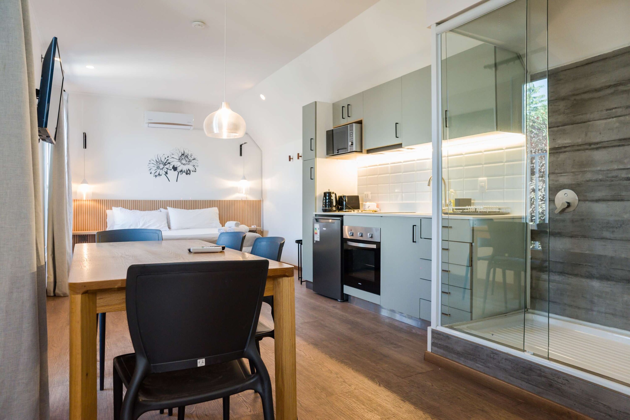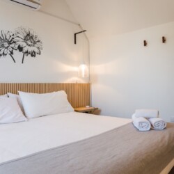 – Living Area: Open-plan space with a plush sofa bed and flat-screen TV, perfect for relaxation or additional sleeping. Tranquil space with a queen-sized bed and ample closet space with hangers.