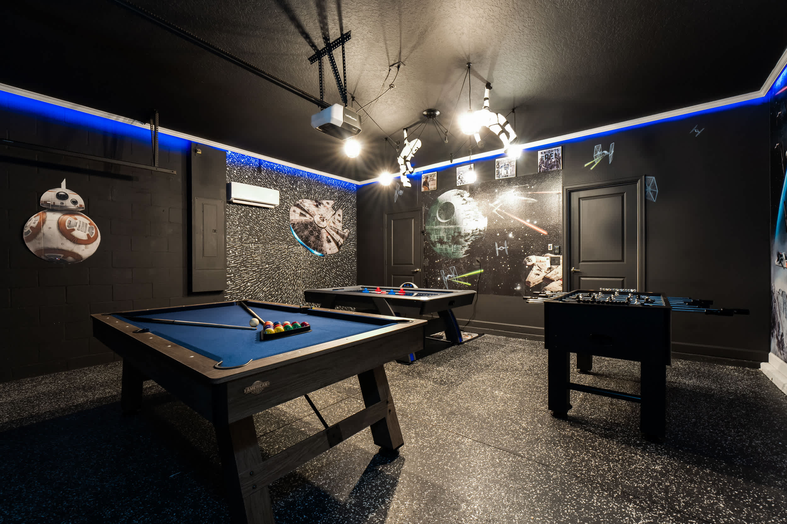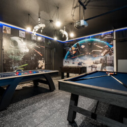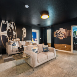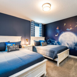 Step into this spacious 9-bedroom villa, designed for comfort and fun, accommodating up to 21 guests. The first floor offers two king suites, perfect for privacy and relaxation. Upstairs, themed rooms delight with a Mickey Mouse room featuring twin beds, a Jurassic World adventure with a jeep and bunk beds, and a Neverland escape with full beds. Key amenities include air conditioning, cable TV, and a fully equipped kitchen with a dishwasher. Enjoy the Star Wars game room, or unwind by the pool and spa.